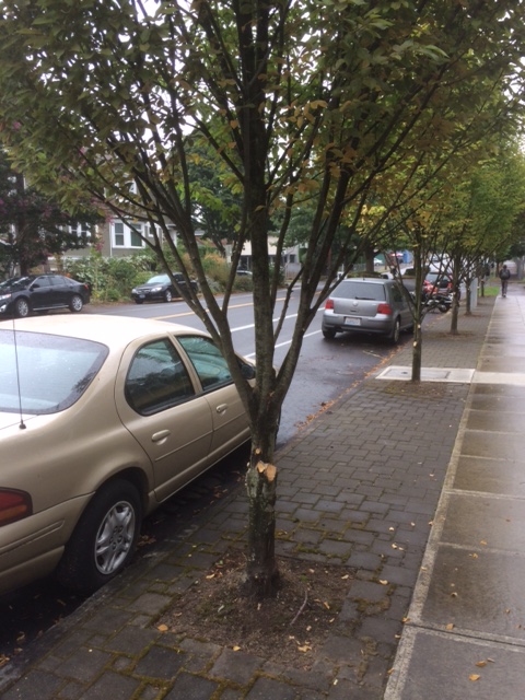 In the above photo the lateral branching begins at about 36” above the root flare at the ground. You can see how these laterals are vigorously challenging each other for dominance. There is little hormone produced by this plant to suppress its laterals. These branches will continue over the years to add wood and caliper up to an ever greater diameter. As you can see this will put them into more conflict with both the parked cars at the curb and with pedestrians on the sidewalk.