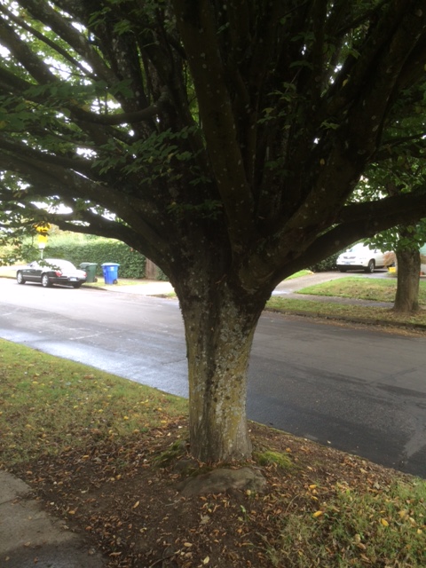 Genetics determines to a large degree what any living thing will look like. It will define how it grows and responds physically to damage and stimulus. It can do nothing else. If you want to grow a decurrent tree in a narrow space like a parking strip you will have to take some informed action and prune it in a timely manner to reduce injury to the tree. There are thousands of trees around Portland that have been planted and forgotten. I dodge them all the time when I go on walks. It is as if people believe the as a tree grows it pushes up out of the ground lifting all of the branches with it. No!!! The position of the heart of the branch is static. As wood is added over the years it effectively gets ‘lower’ and because of a trees growth response to gravity a branch actually adds more bulk to its underside to support the increasing weight of the branch. Keep in mind that a branch that is a problem now will be a larger problem in years to come. The lesson is to know how your tree grows and to make ‘training’ cuts at a young age to minimize the size of the wound.