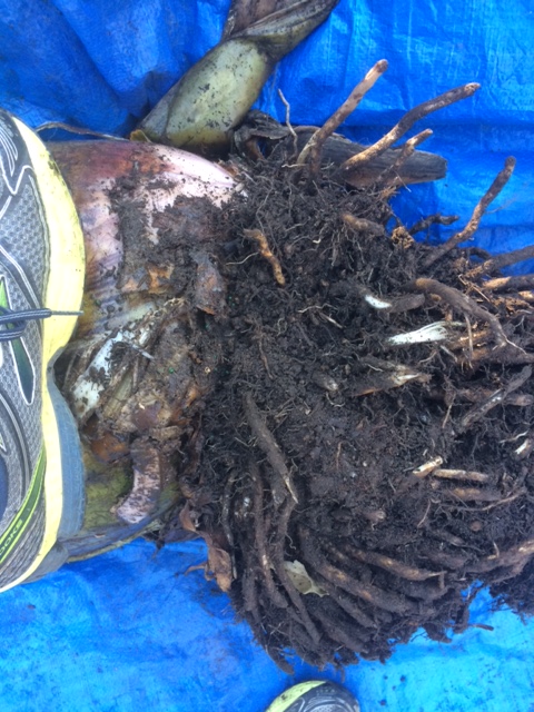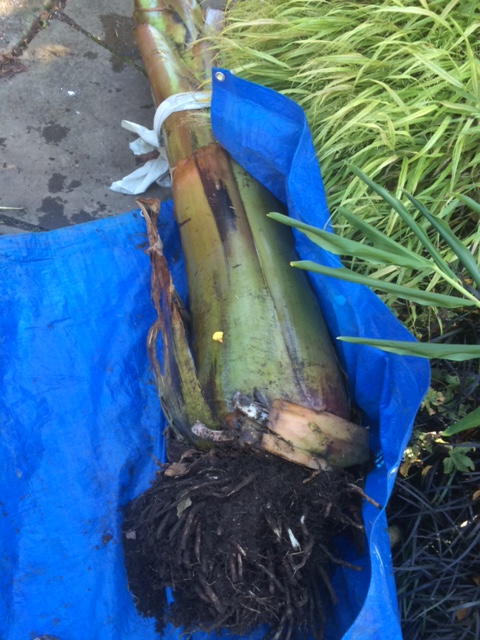Rolled on to the tarp. Half the tarp is not showing below the roots. I’ll fold this end up to cover the psedostem