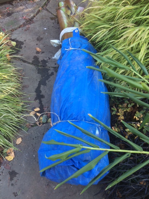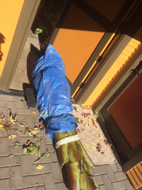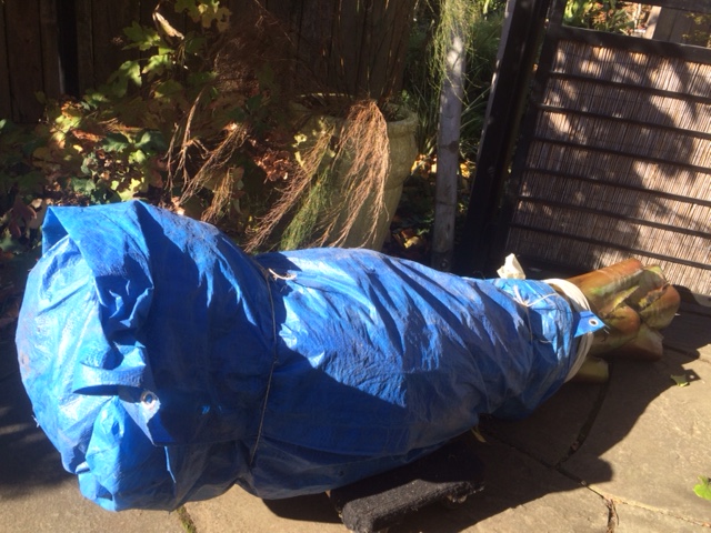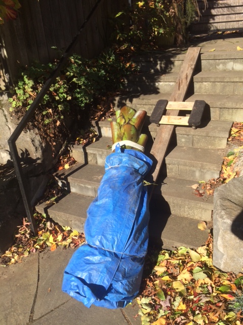 Once free I lay it on a blue tarp, wrap it up as if it were a diaper and tie it in place. It is usually too heavy to carry through my garden, down the 7 stairs, around to the front and then into the basement, I’m guessing 200lbs+. I get it on a dolly, roll it to the stairs, skid it down a plank, get it back on the dolly and wheel it around through my street grade basement door, get it close and then stand it up where it will spend the winter. I stand it, because it never really stops growing.
