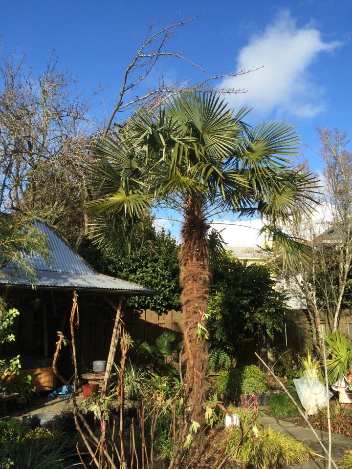 Trachycarpus fortunei – My only female of the five. This tree has the ‘flattest’ canopy as the petioles more quickly flop then kink and hang straight down. I don’t think this is characteristic for the girls. It just shows more of the variability possible with seed grown plants. I’ve just finished removing the ‘worst’ fronds and the remaining fruit structures which are amazingly heavy with fruit that looks like it could come off of a Mahonia or Juniper. This tree tends to have the roundest fronds of my plants.