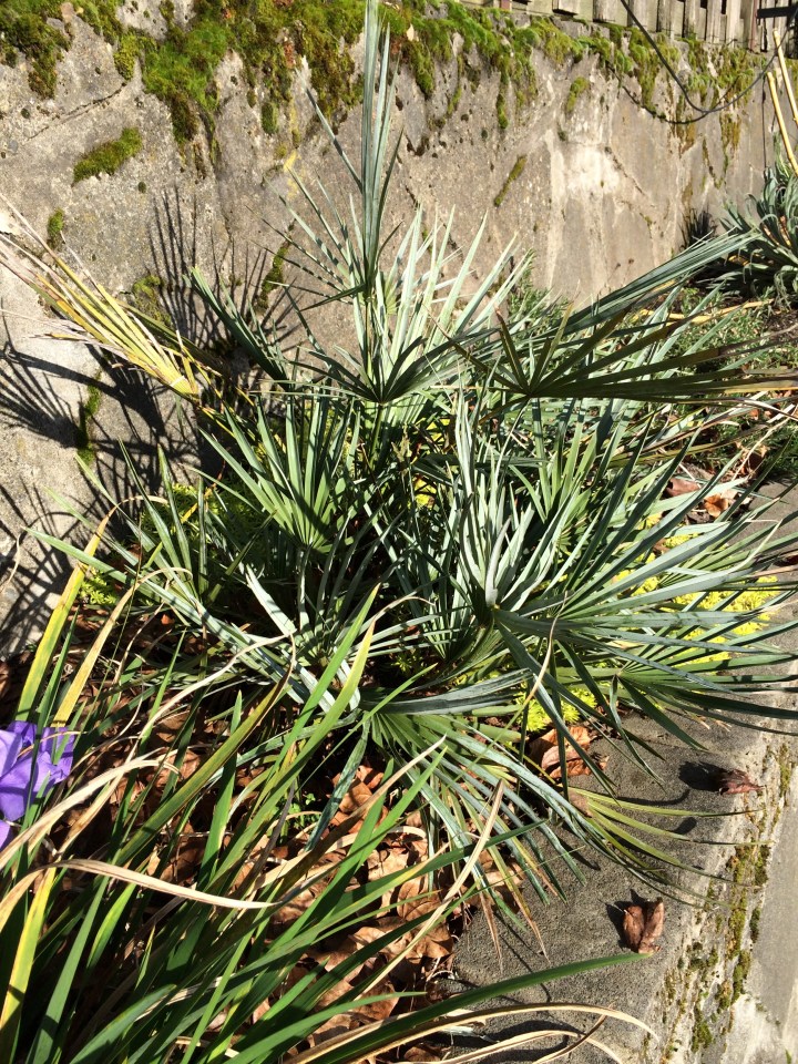 Chamaerops humilis cerifera – The Blue form of the Mediterranean Fan Palm from the Atlas Mountains in Morocco. I planted this one out the summer before last and protected it by packing it in leaves last winter. Chamaerops form multiple stems at the base. This plant rebounded from significant loss last winter. This winter, so far so good.