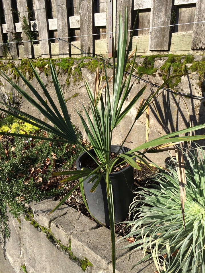 Sabal x ‘Birmingham’ – Another young experiment for me. This is its second winter in a pot. These love heat and can form palmate fronds several feet across, much larger than the Trachys. I will keep this in pots, periodically up-potting for several more years. It’s origin is confused. Some palm experts think one parent is S. minor which is very slow. In North Carolina these can take 13 years before they start to form a trunk! So, ten more years??? No problem! On the plus side, S. minor has added considerably to this palm’s hardiness. I have a vision of this at the top of my retaining wall when we redo the fence.