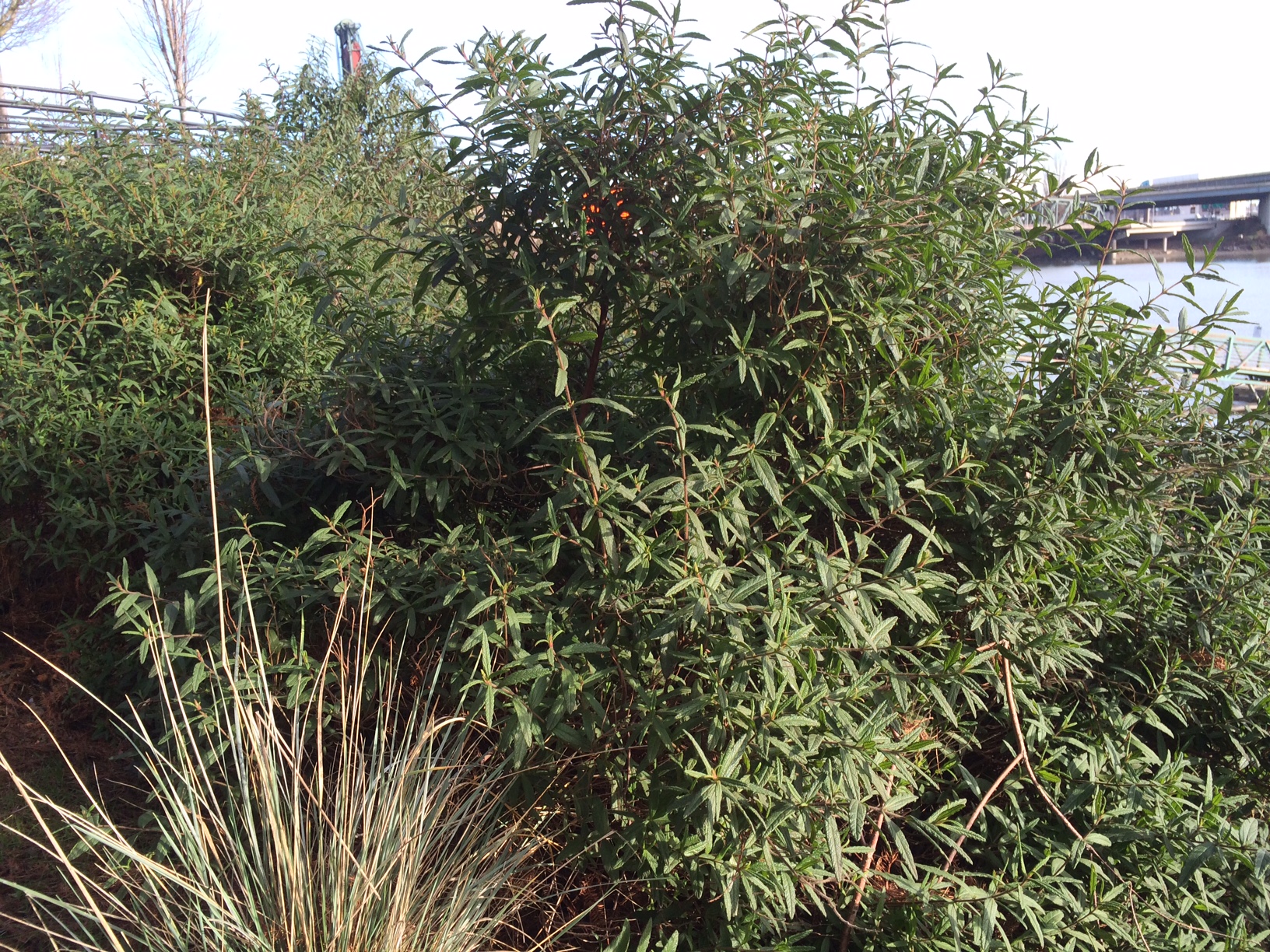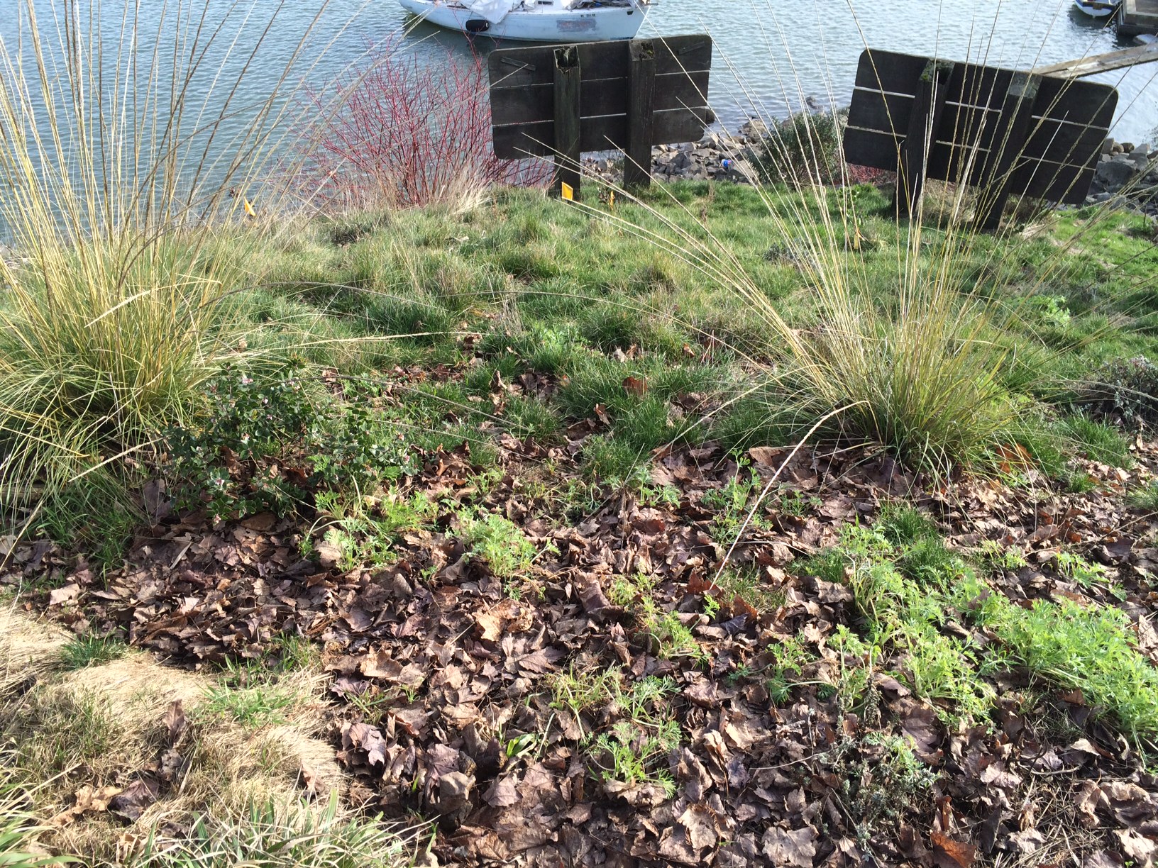 Arctostaphylos pajaroense ‘Warren Roberts’ with volunteer Redtwig behind down in the rip-rap. Ramp to the north breakwater in background.