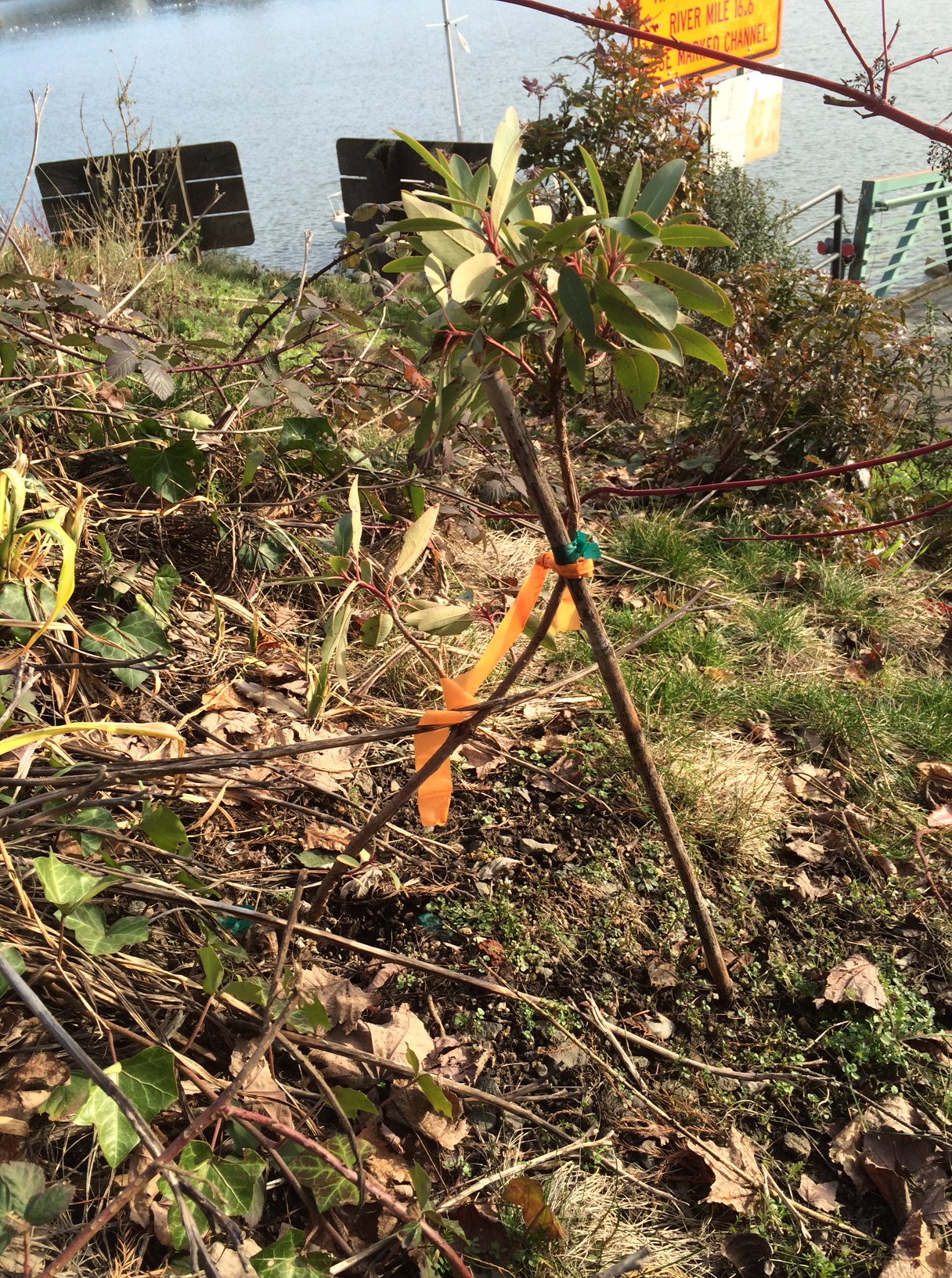 One of three Quercus wislizenii at this end of Riverplace. These were all cut down in their first year by beaver. Seems to be a common response to browsing.
