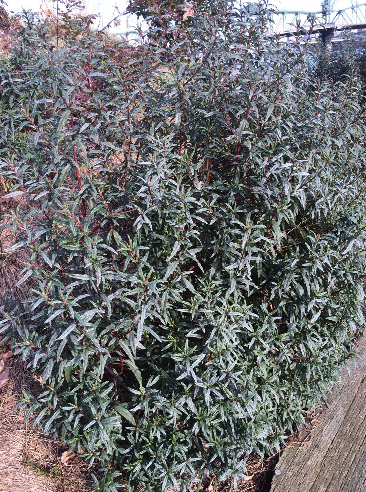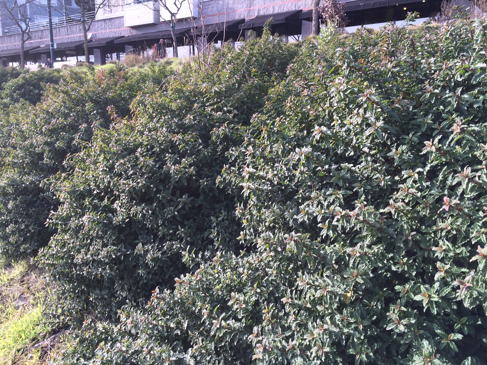 Rhamnus alaternus ‘Variegatus’ planted between the Blue Oat Grass and gradually dying out Cornus ‘Kelseyii’. It has been very slow. Understandable given the horrendous fill soil conditions. In the immediate area are also a young Quercus chrysolepis, Arbutus menziesii, Arctostaphylos x ‘Pacific Mist’, Cistus x ‘Blanche’, Philadelphus lewisii, Cotinus coggygria ‘Golden Spirit’ and Holodiscus discolor