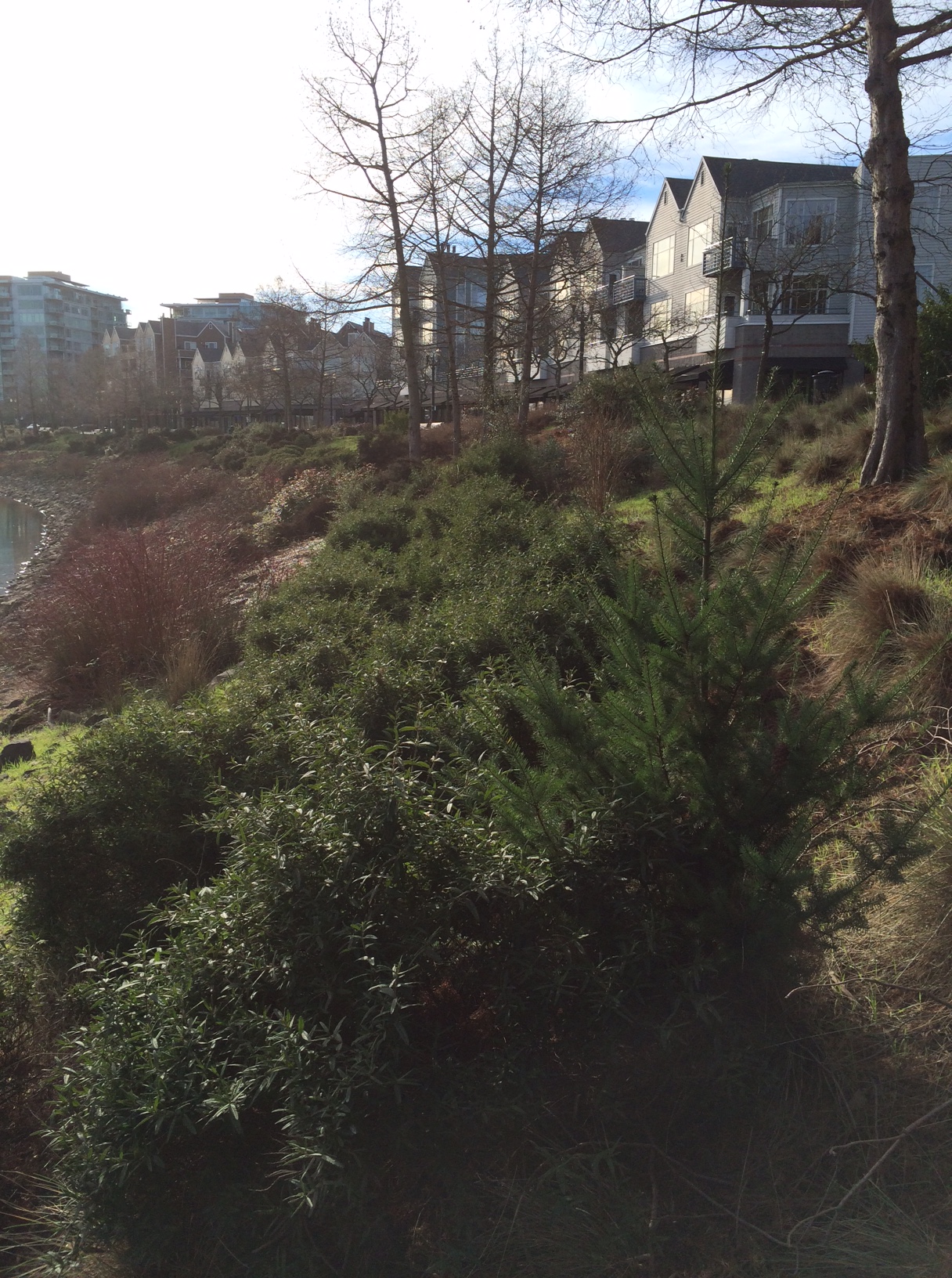 A volunteer Doug Fir (hmmm) growing with a very happy sweep of Cistus platysepalus, Taxodium distichum marching along the bank and Redtwig Dogwood in the rip-rap.