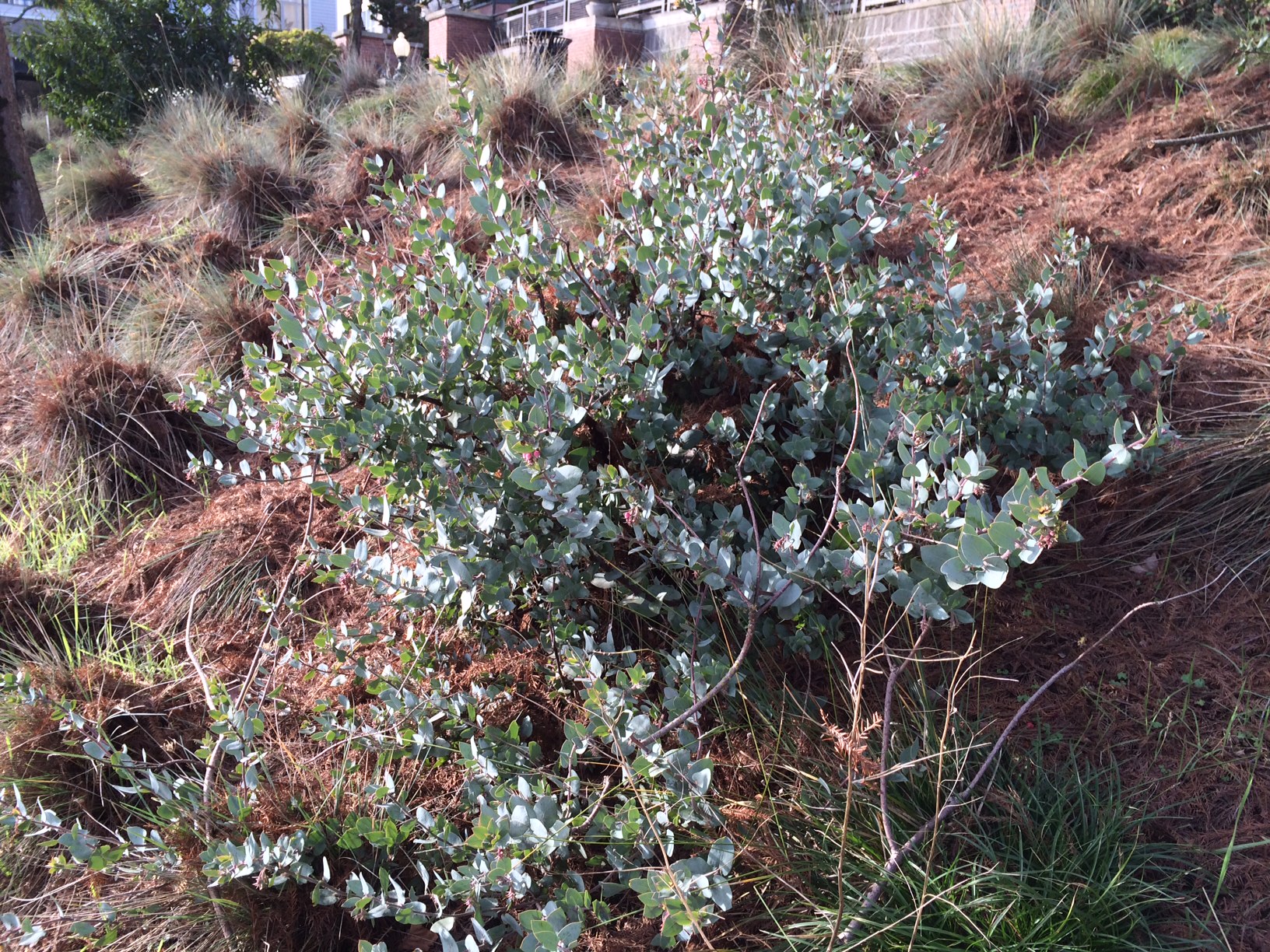 Arctostaphylos viscida ‘Sweet Adinah’. Keep your fingers crossed that no one, i.e., campers/drinkers, stomp it. Lost one of three here at Riverplace. This too was planted where the C.I. ‘Vandenberg’ has been failing.
