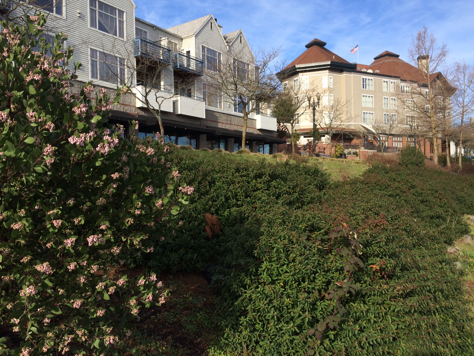 This little tour begins from the traffic circle at the intersection of SW Montgomery St. and River Dr, by the sign to South Waterfront Park and Garden. It has you walking north along the esplanade in front of the shops and restaurants. It concludes about 900′ to the north at the Riverplace Hotel.
