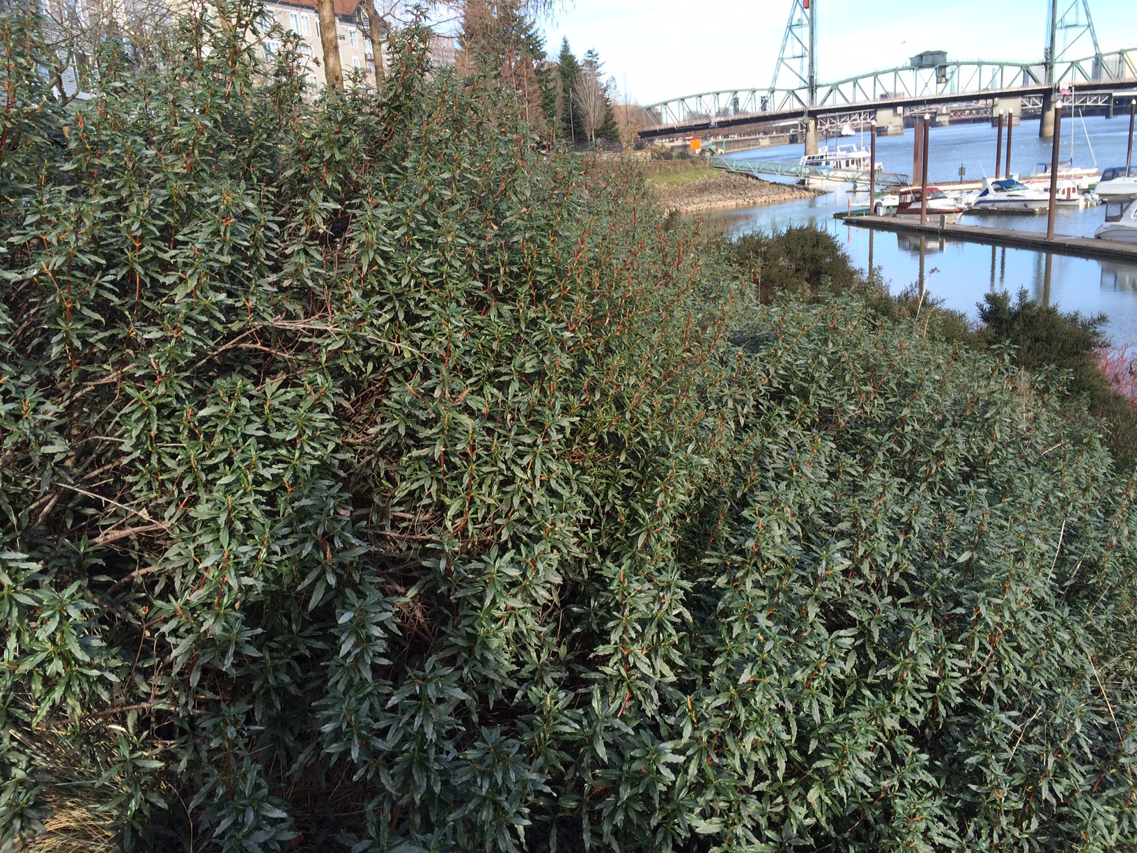 Another sprouting Quercus wislizenii amidst Cistus x ‘Blanche’ and the bare stems of Philadelphus lewisii. (Hawthorne Bridge in the background).