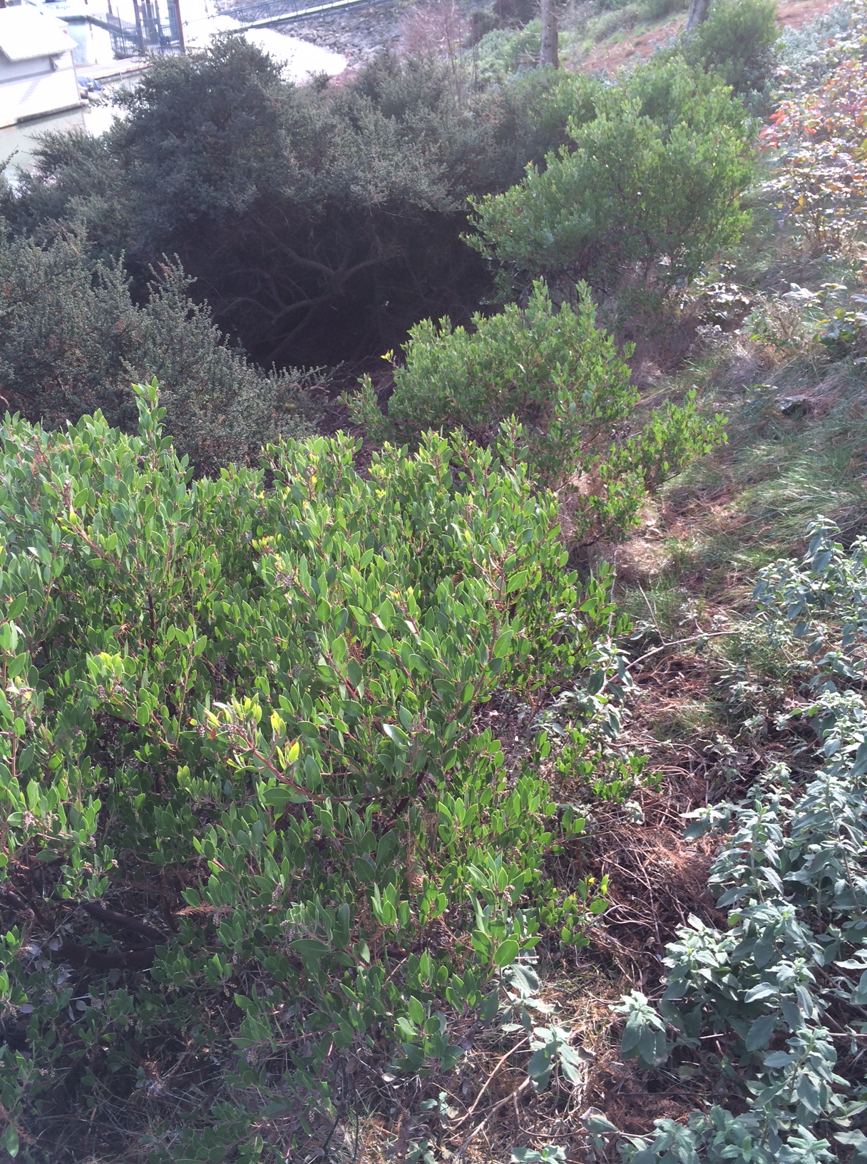 One of the Arctostaphylos viscida ‘Sweet Adinah’ scattered in the dying clumps of Ceanothus i. ‘Vandenburg’. This one is furthest south. These dead ‘holes’ have been heavily invaded by primarily annual weeds. A volunteer Deschampsia caespitosa, I believe, nearby.