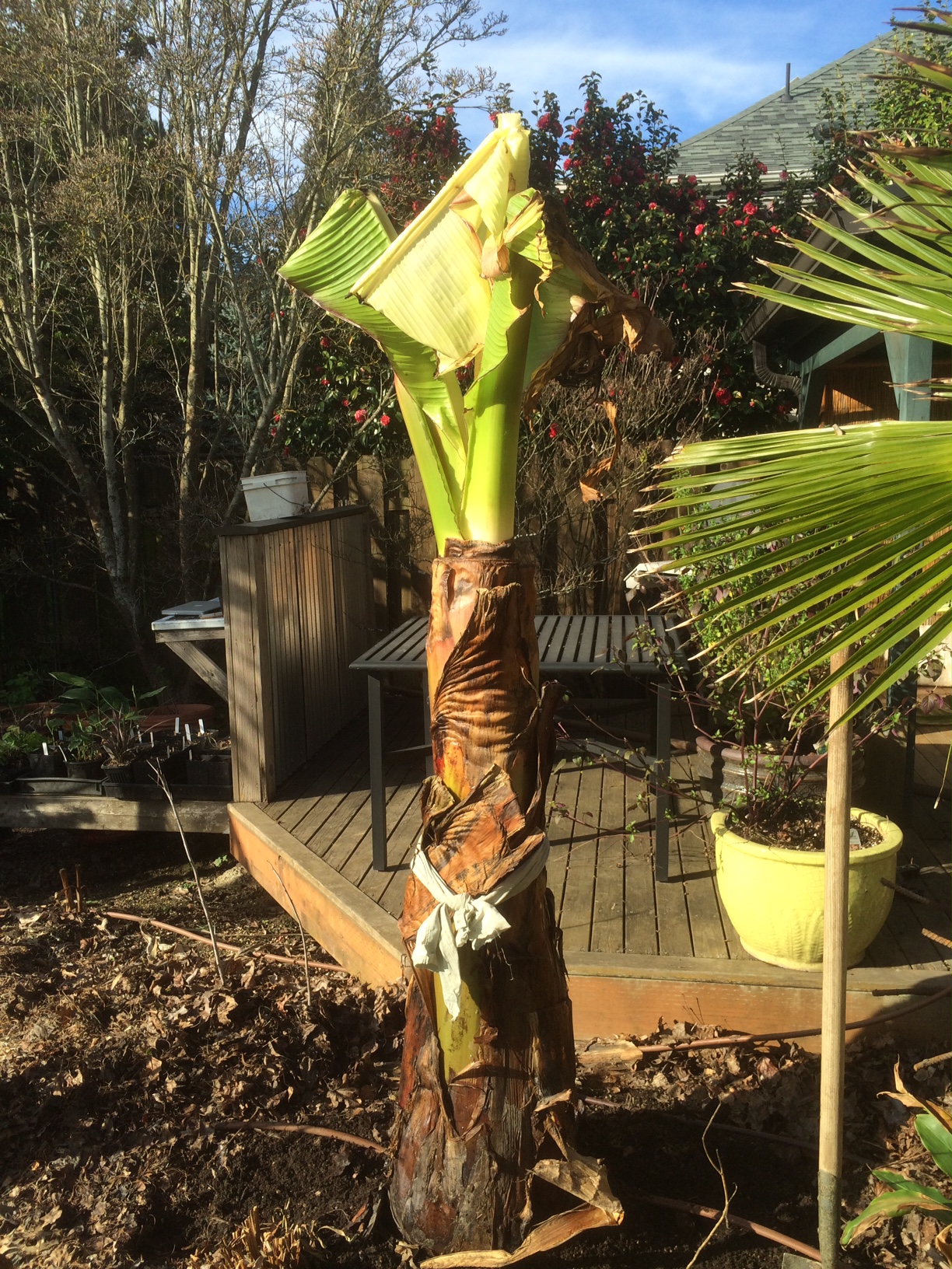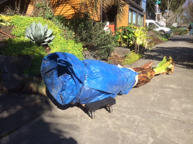 Okay, this seemed heavier than last year. I stand the Banana up, bear hug it, and lift it one step, move forward and repeat seven times!!! (It’s a little hard to take a picture of myself doing this.) Here you can see how the roots grow through the winter in its diaper. One of these years I should weigh it, first when I dig it and later when I plant it so you can see how much respiration and transpiration happens during winter storage.