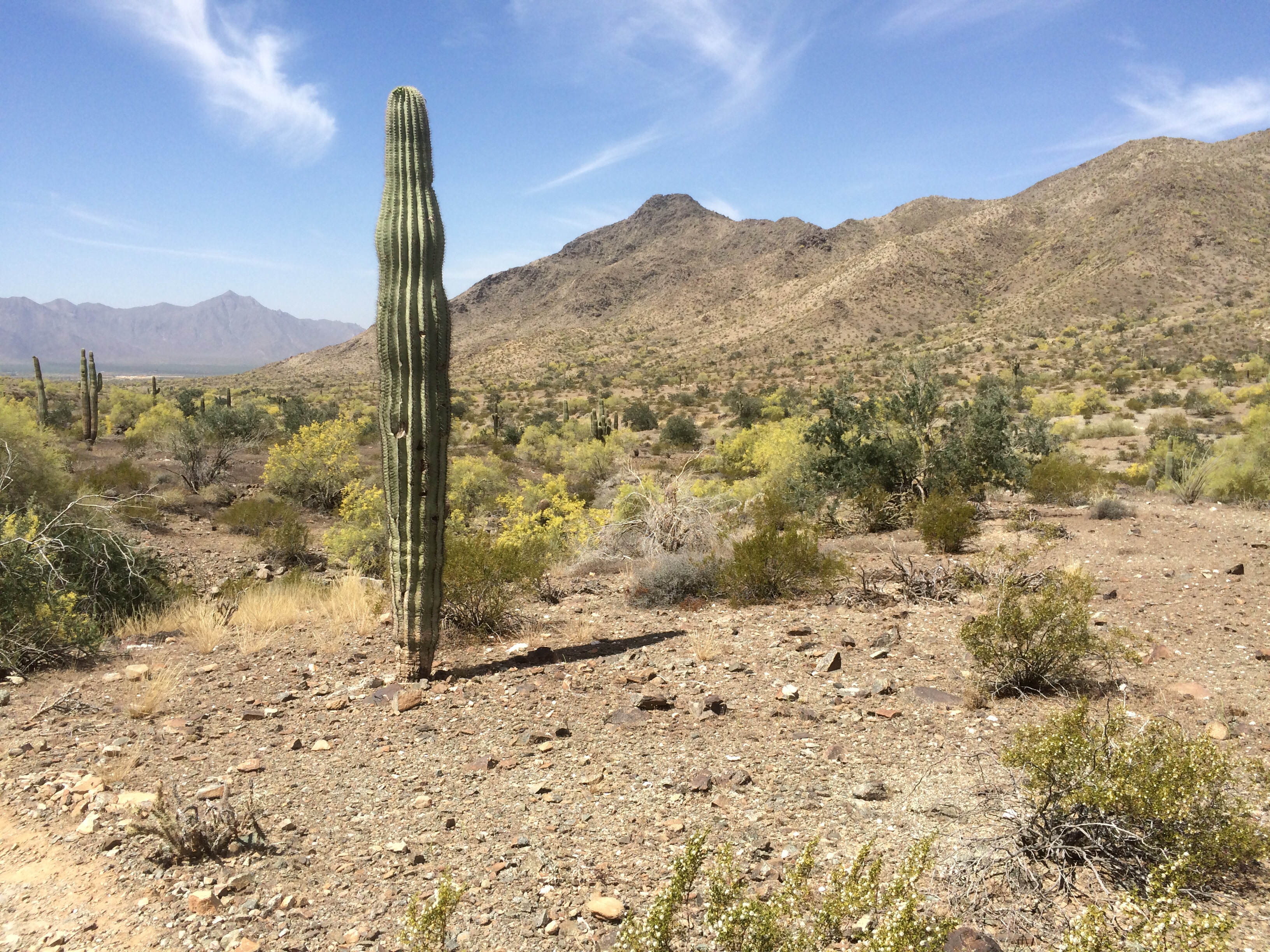 A Saguaro along the Bajada Trail looking toward the Estrella Mountains in the distance to the west and Ma Ha Tauk Range above me to the right.