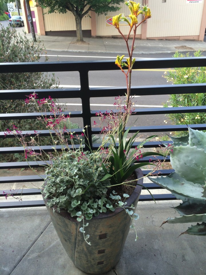Pelargonium and Anigoanthos sharing porch space with an Agave colorata