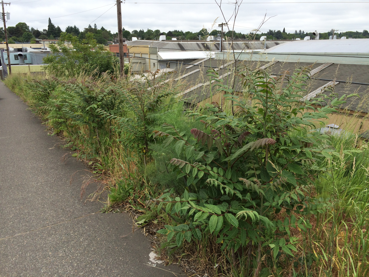 Tree of Heaven – Alianthus altissima – State noxious weed. On the City’s B list. Opportunistic heavy seeder. Several mature trees on and adjacent to the sites. Seedlings widely scattered.