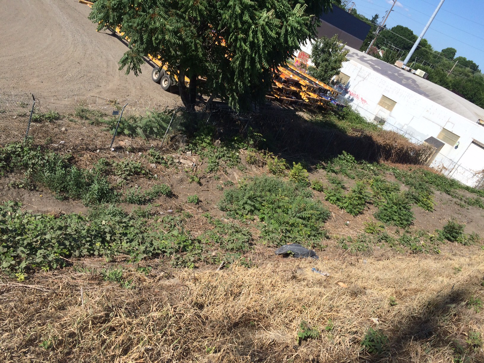 None of these are desirable landscape plants or natives. They exist in an out of balance and dynamic mélange. Each of these four ‘sites’ contain most of the plants listed here though the balance and mix vary. They’re ‘managed’ in a simplistic and crude manner. They are simply left on their own until they’re mown down on a loose annual schedule, when the City’s Bureau of Transportation’s budget allows. The North-East site was mown in early April along with much of the trash left at the homeless camp which nested at the base near the fence ‘protected’ by Blackberries 8’+ tall. By mid May the Blackberries and Tree’s of Heaven were re-sprouted and beginning the cycle again. This particular section is the widest and largest containing more flat land at the base before running up against the Railroad’s fence. The piece of equipment that worked this site tore much of the bottom portion up making it ripe for the germination of whatever seeds are available on site, when rainfall permits. Broken rubble is visible along with much exposed and partially buried trash.