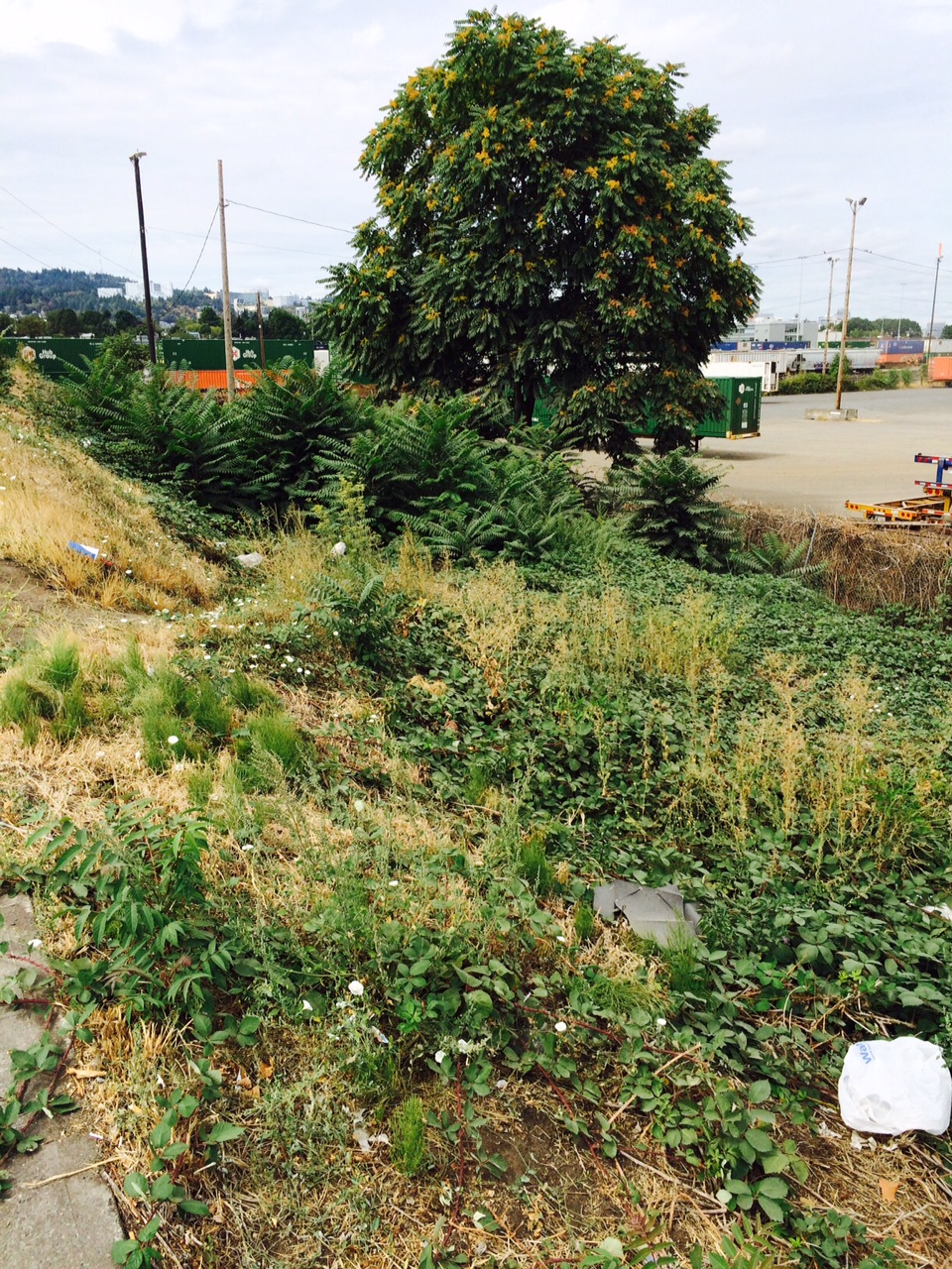 The upper portion of Duniway Park. A Nyssa sylvatica growing at the toe of the slope below OHSU. The turf is completely unirrigated, is very compacted and has poor drainage. Much of this turf is dominated by a few broad leaf weeds while most of the grasses that survive are weedy as well. The whole Park is built over one of Portland’s first dumps.
