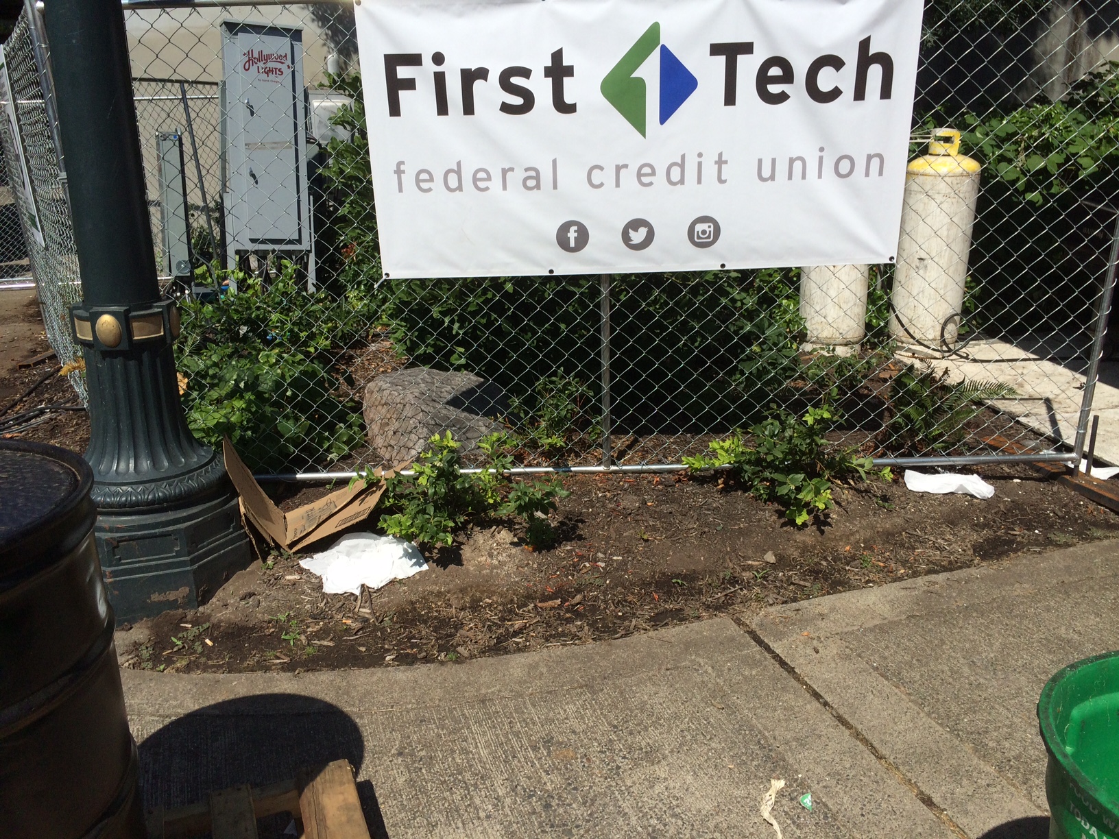 This bed was planted nearly to the sidewalk, here contains portable fencing, cables and electrical equipment, all placed by vendors to meet their needs…obviously not those of the plants, many of which have been obliterated. This was taken during the breakdown/ clean up after the Blues Fest.