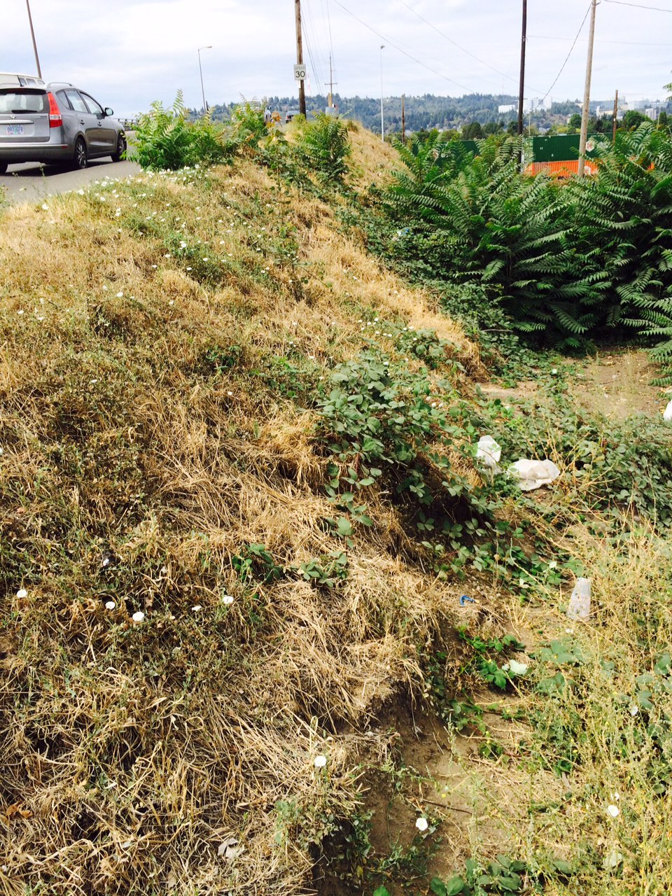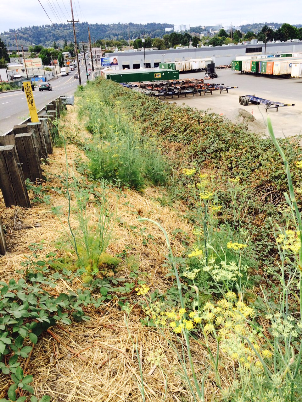 It finally rained this last weekend! Somewhere around .3″. Woohoo! It will be the most rain that we’ve received since March. It’s been dry! In April the City cut down the ‘weedscape’ on the northeast approach of the Holgate Overpass. It’s rained very little since and we’ve had record warm temperatures all summer. No one has come back to spray, plant or do anything. No one’s even picked up the trash. If you compare the four ‘weedscapes’ on the two approaches they are very similar. The NE, by volume has had the most regrowth. This is for two different reasons: first, this site was cut earlier in the season when there was more moisture still in the soil to enable regrowth, and secondly, because the site is dominated by Blackberry and Tree of Heaven, both perennials, well established and of larger stature than the plants dominating the other approach landscapes.