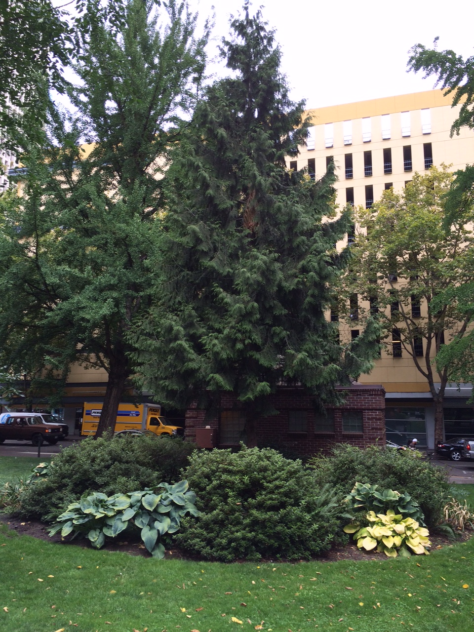 I kept replanting as I had time. Behind the women’s restroom on Chapman, after the Occupier exodus, I pulled out broken Azaleas and began trying to plant natives and other things I thought might be better adapted. A Mahonia x media ‘Charity’ appears to be doing fine. I tried more ferns like Cyrtomium, planted Epimedium some more Yak Rhodies, which perished due to conditions and tromping feet, as did a Ribes sanguineum ‘Pulborough Scarlet’. People still felt the need to walk back here, occasional campers, come and go. And the Thuja always sucking up whatever it can. A plant’s life downtown can be iffy, even when well chosen for site conditions. The human factor of use and abuse can switch on and off unpredictably.
