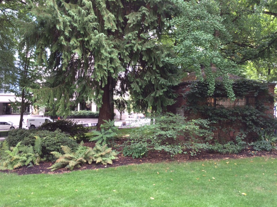 This shows the bed behind the women’s restroom on Chapman with its thirsty Thuja plicata underplnated with the Azalea’s I could save, Mahonia x media ‘Charity’, Corylopsis pauciflora and Hydrangea petiolaris anomala climbing the building that we keep pruned off of the roof so that it doesn’t tear it apart.