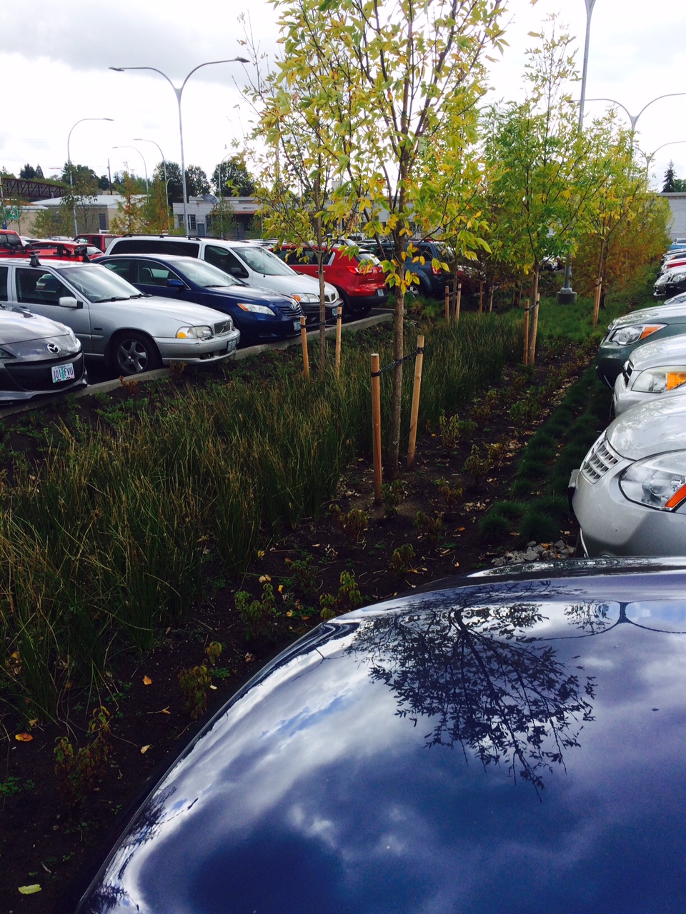 The parking lot repeats the Dechampsia though they’ve added some tree form of Amelanchier, lots of western red cedar and the non-native low growing Cotoneaster and Rubus calcynoides. Some of the bio-swale’s appear to be topped with blue fescue and while the Galaxy Magnolias, used along SE 17th Ave make another appearance planted in the bottoms of the bio swells. Again a use that is in conflict with its needs. There is also a reappearance of the Rushes in the bio-swell to the south oddly with Viburnum tinus put in the bottoms as well where they will be inundated and suffer.