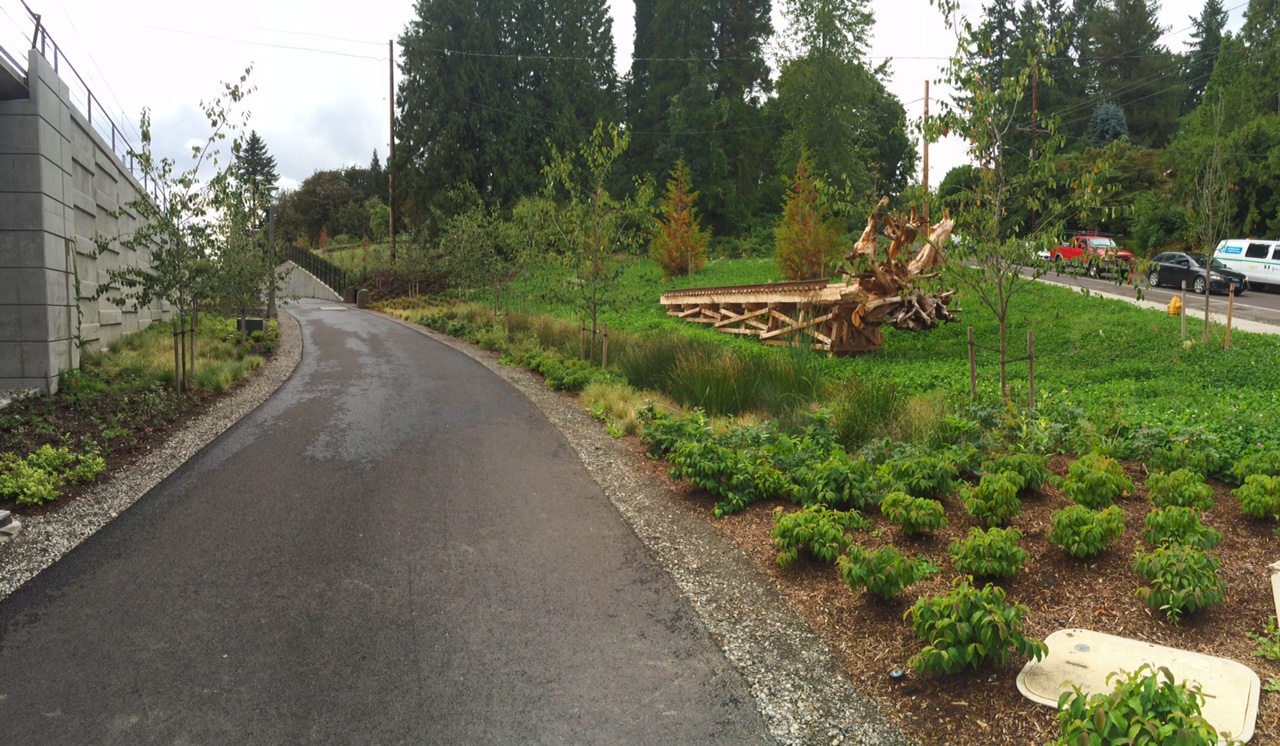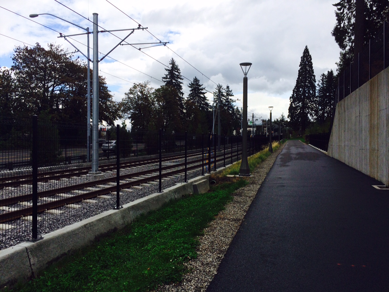 This shows the Trolley Trail disappearing into a grove heading south from the bio-swale west of the parking structure providing riders with a safe, from car traffic, route to the Orange Line or on to Millwaukie.