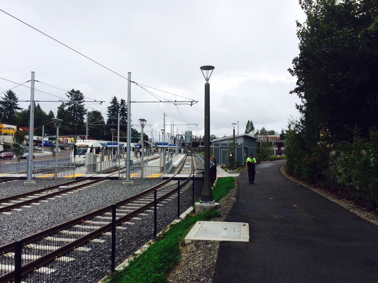I was surprised when I left the Milwaukie Station on my bicycle that I wasn’t thrown into the mess of auto traffic on Mcloughlin. I was prepared to take River Rd. and arrive at the Park Ln. terminus from the back. There is, however a bike path, clearly marked, though it is a little sketchy as it plies its way around and through cross traffic and the supports for the overhead tracks before starting up the hill separated from Mcloughlin by the tracks themselves. Nice!!!