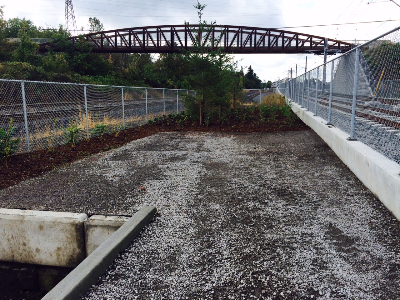 North of the stop is a large triangular bio-swale that takes much of the water from the new hard surfaced areas.
