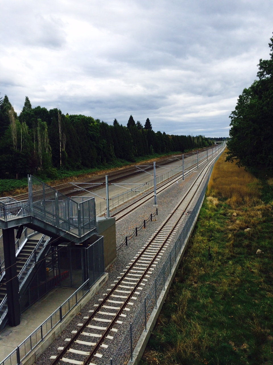 Here i’m approaching the station at Park Ave, the terminus. A narrow strip of Clover to my left and an only slightly wider planting to the right at the edge of private property. That’s a security guy heading toward me. He was curious where the path went as passengers ask him and he had no idea. Three trains can stop, dock, moor here at once.