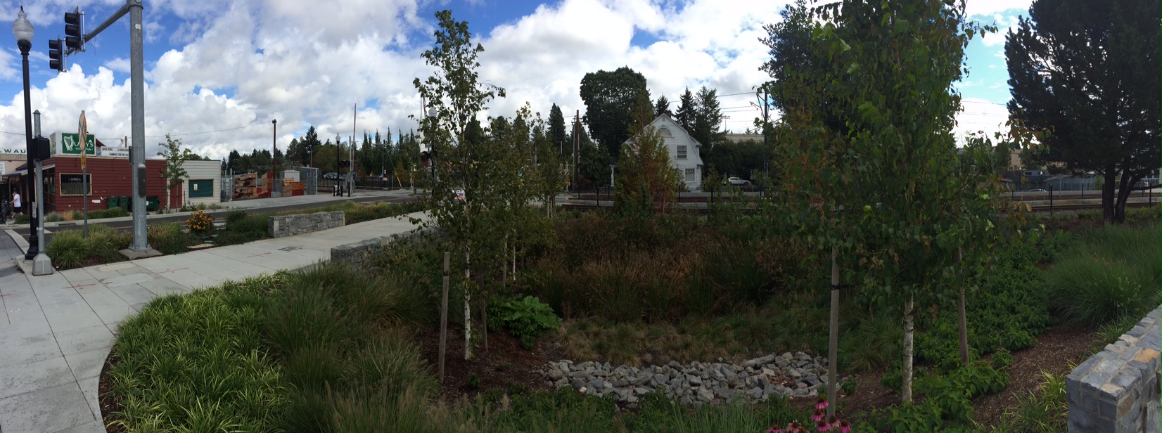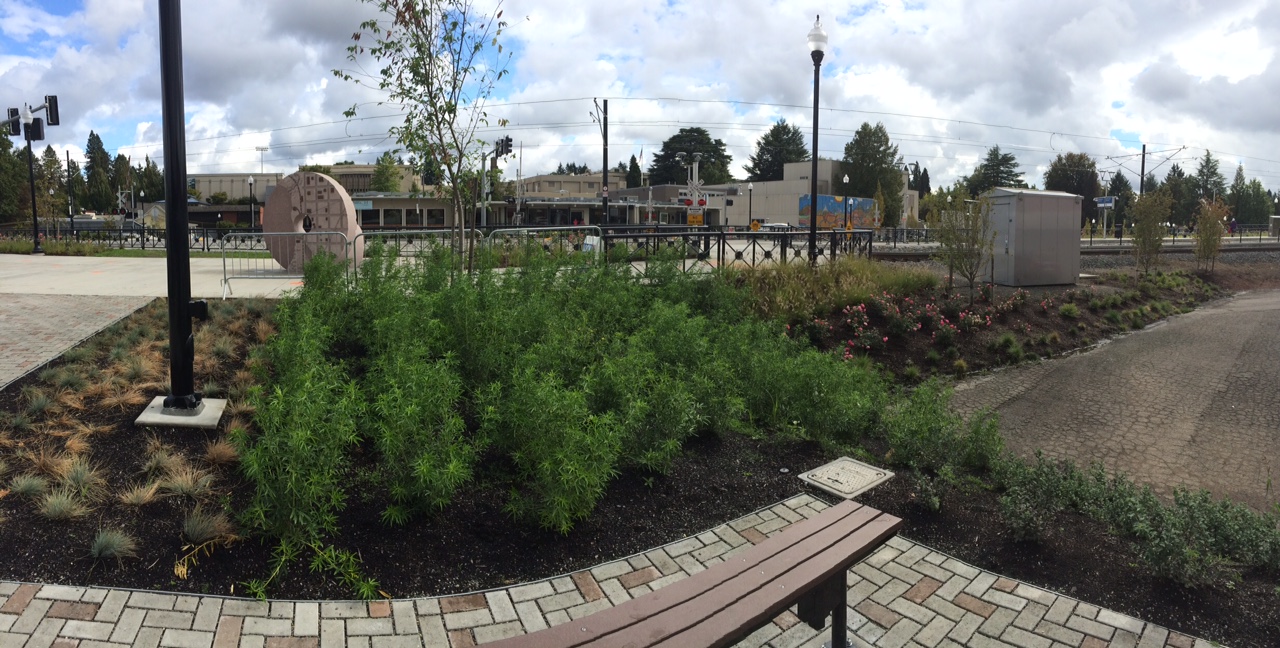 At the terminus itself is a large Plaza, a big parking structure, several art installations, covered bicycle parking and a rest area for the train operators. Miracle of miracles I spy my first plantings of our native Garry White Oaks next to the train stop. Garry’s are much slower growing than the other more commercially available Oaks in the trade. They are also less tolerant of root disturbance when dug and moved as larger trees. They are, however, supremely well adapted to our conditions here in xeric plantings. This planting, as are all of the others that I noticed, are irrigated. Valves could be shutoff after establishment and it would benefit the Oaks, however, some of the understory may suffer as a result. These plantings, like many of the others could be ‘tweaked’ reducing their need for irrigation and the ability of many common weeds to invade. This somewhat triangular space is probably 5000 ft.² alone. The appearance of the Oaks is fitting as we approach the community of Oak Grove, historically populated with many of the grand trees, now lost to development, but making a bit of a resurgence with the help of dedicated plantspeople and local organizations.