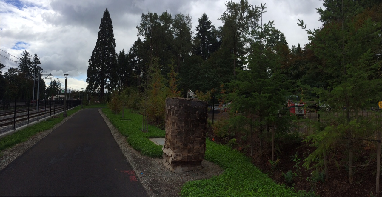 Right after leaving Mcloughlin Blvd and crossing under the Orange Line the path widens to this and is mostly bracketed by long plantings of a predominately native theme. There is a large swath of Dutch White Clover surrounding the ‘tree/trestle sculpture’.