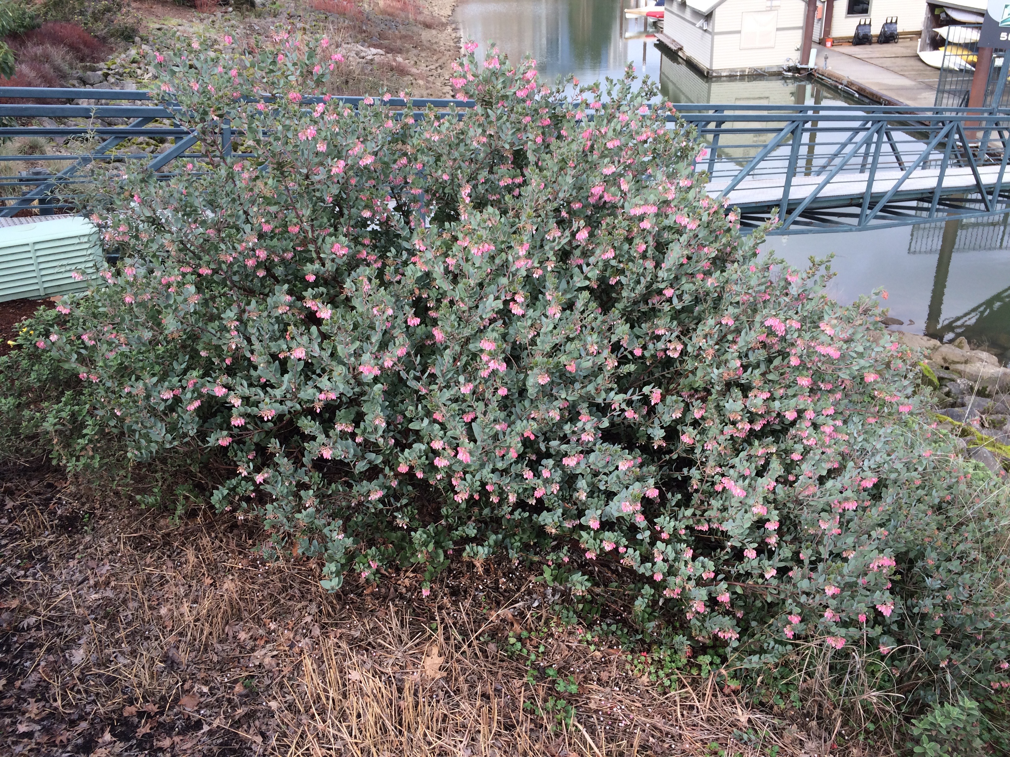This A. pajaroense ‘Warren Roberts’ is planted on the bank next to the ramp going to Riverplace Marina on the Willamette. Next to it, by the vented green ‘box’, was an Arbutus menziesii that was established and doing well, untill the irrigation system was inadvertantly turned on. It collapsed quickly. This Manzanita and others nearby, including A. ‘Sunset’, hardly seemed to notice. I wouldn’t recommend the practice. Two Arbutus arizonica also perished.