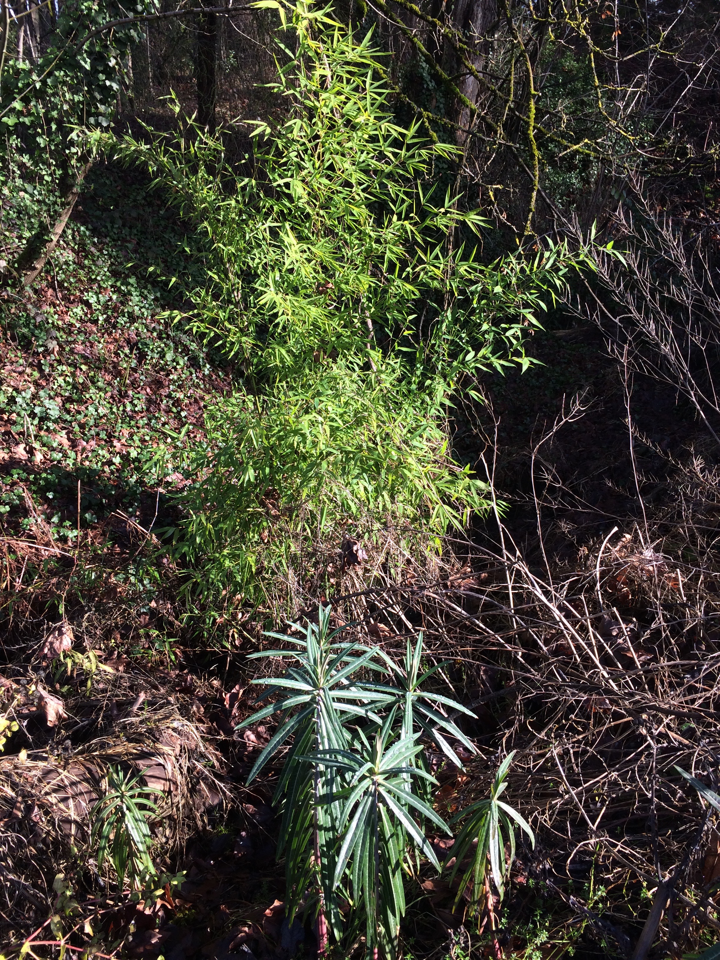 A Phyllostachys, Bamboo, and a Euphorbia, Gopher Spurge, with English Ivy running up the slope in the back. Weeds arrive in many ways sometimes by bird, sometimes as contaminatants in purchased materials and other times intentionally brought in, by you or somebody else.