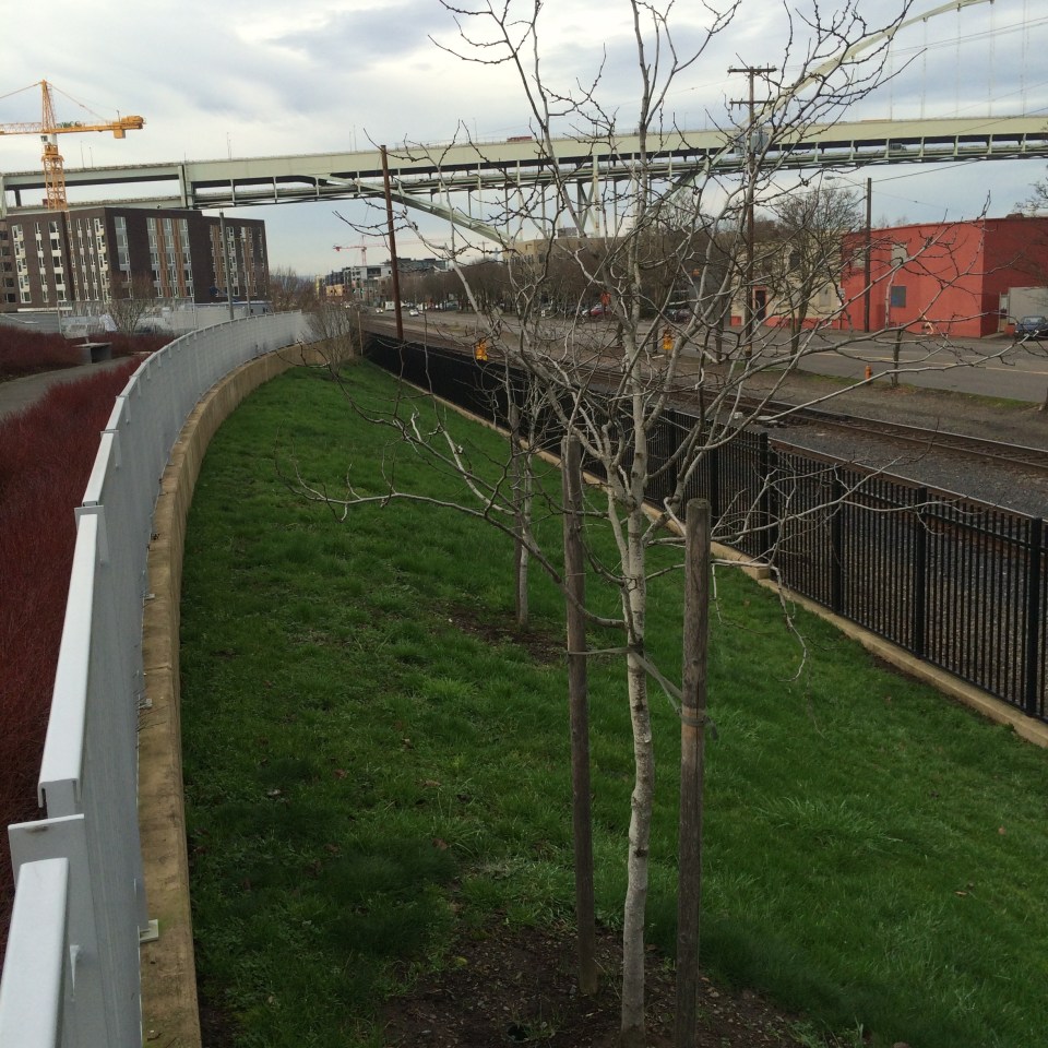 IMG_4418 Next → The bank to the north. This area is steep which complicates the work done here. The fences at top and bottom compound it. Here are the remaining Cercis canadensis Alba. Other woodland edge small trees have failed on this hot exposed site.