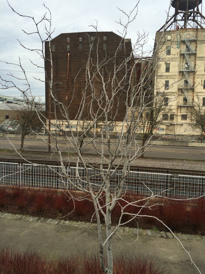 The abandoned Centennial Mills site across the way with the odd choice of Cercis canadensis Alba in the foreground. The following is from the Missouri Botanic Garden description of this plant: “The best environment for white redbud is full sun to light shade with moist well-drained deep soil. It is adaptable to other soil types but will not grow well in permanently wet or poorly drained soil.”