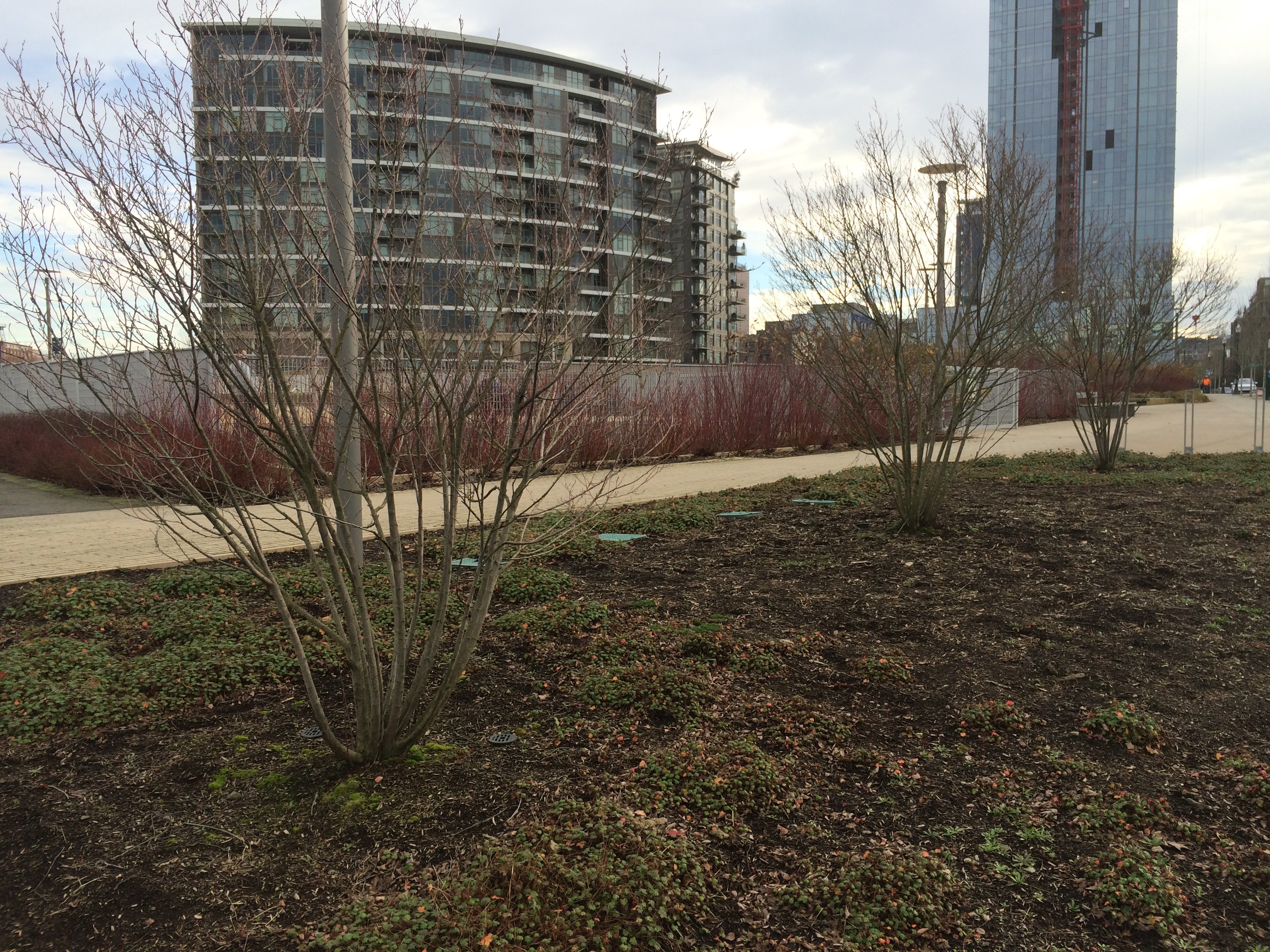 At the north end of The Fields where 11th ends at Quimby. This is a very simple planting of Amelanchier alnifolia with Geranium x cantabrigiense as a groundcover. This is normally a very dense groundcover, a good weed supressor, but on this site is having trouble filling in. One species groundcovers over large areas are often problematic in that there is nothing else to fill in if they have trouble. The Redtwig Dogwood against the fence in the background is the cultivar ‘Isanti’ and should stay in the range of 6′ tall so that it will require less routine cutting back than the species.