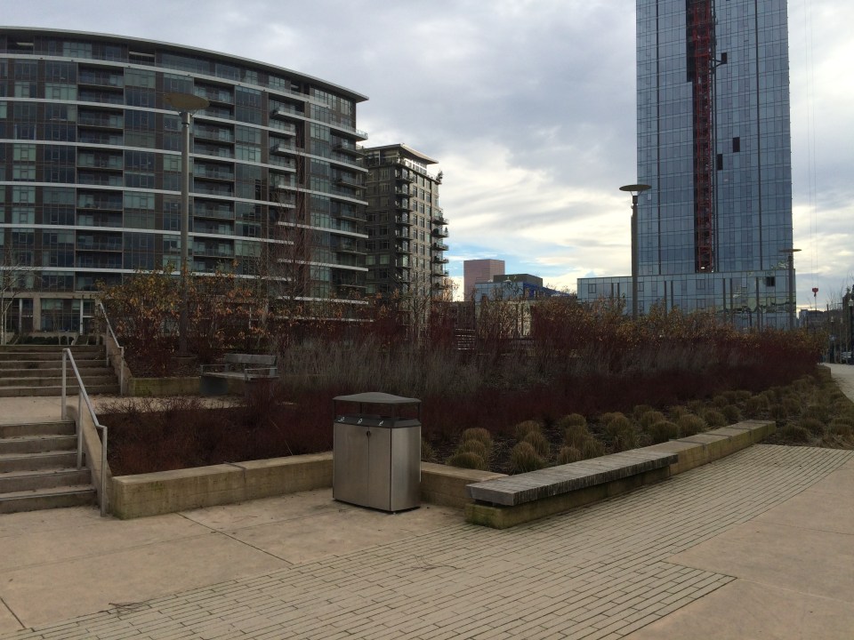This northwest facing bank planting includes Cornus stolonifera ‘Isanti’ at the top, Perovskia atriplicifolia is the lighter grey middle band, with Cornus s. ‘Kelseyii’ below it followed by Helictotrichon sempervirens. This have differing water preferences. The bed is all on one irrigation station so will water equally. The Blue Oat Grass at the bottom of the bank will be the wettest due to surface runoff and ‘needs’ the least amount of water, in fact it is subject to rot with routine irrigation.