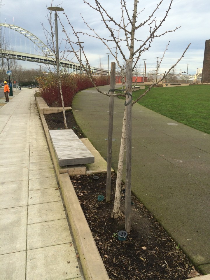 This is a typical problem in a Park landscape. Hardsurfaces require a stable base material, generally gravel, here it is 3/4 minus with larger rock beneath to support the occassional/routine use by Park’s vehicles. This base extends out from the hard surface on a relatively wide angle. The soil below it is compacted before the gravel/rock is installed. The surface to the right is an experimental porous concrete mix to minimize runoff. This requires the base rock as well to help contain the water that percs through. It may require even more base support as this porous mix has less structrual strength than ‘normal’ concrete. These two Gingko trees are planted in a space that is roughly 24″ wide but is effectively much narrower because of the base compaction and rock. These trees have two strikes against them.