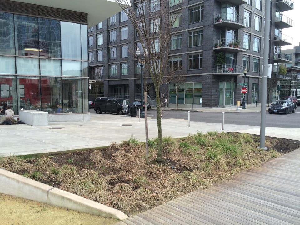 Again this grass has little winter presence and presents no barrier to movement. The Encore’s enterance is just to the left. There is nothing here to direct traffic. No curbing. No benches. No boulders. No larger evergreens. No larger deciduous shrubs, only the single Zelkova tree.