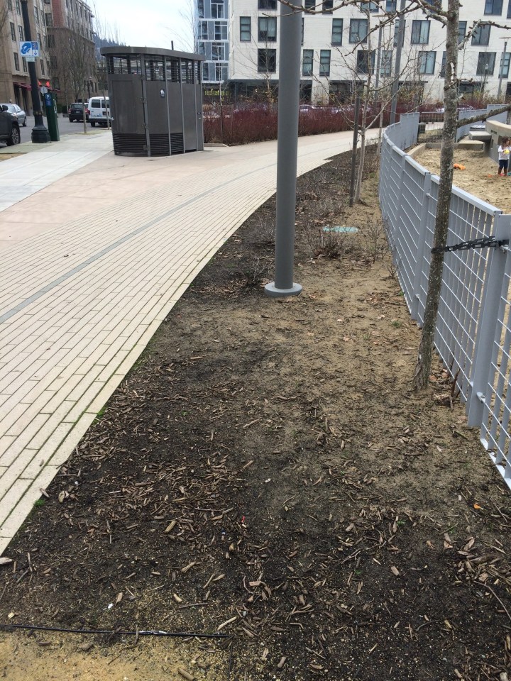 This strip planting along the south side of the Playground is/was filled with Fothergilla gardenii which is heavily used at this end of the Park. It is either stomped out or suffering from soil conditions and reflected heat from the hard surface. Additionally, people walk up to the fence. Many of us argue that high activity areas, such as playgrounds, should not have adjacent plantings especially any that may be brittle. The fence is intended to contain playing children. The sand in the play area is continuously being scattered in to this bed burying the crowns of the plants. Though a little wider than the strip bed on the north side it still suffers next to the hard surface with the playground curb, though there are fewer pipes and conduits here. For some reason this Gingko tree was planted just a few inches from the fence. What happens to the fence when/if the tree grows to mature size?
