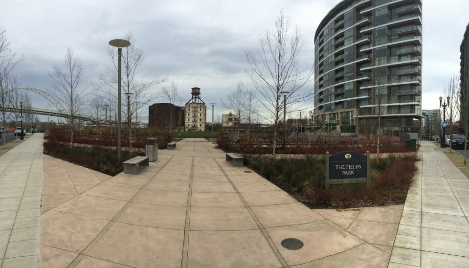 The Park enterance, framed by the four bio-stales that take runoff from the adjacent hard surface as well as from the drain system installed across the lawn. They are planted with Betula nigra cultivars along with Cornus stolonifera ‘Isanti’, C. s. ‘Kelseyii and an Iris. As you walk through the Park you will move over eight different hard surface treatments!
