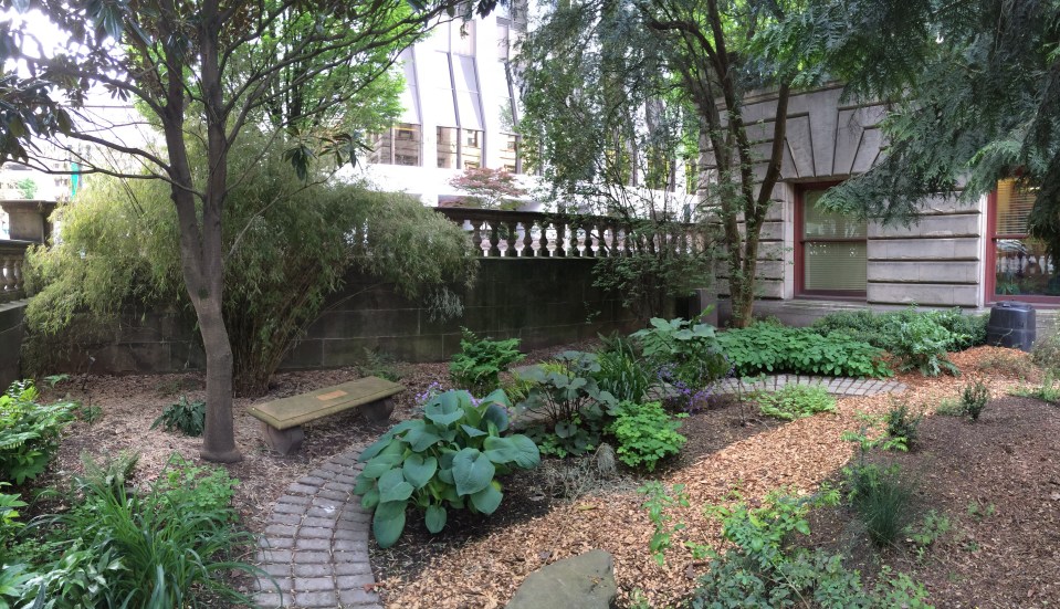 A wider view of the Keeston Lowery Garden. This is a shady space with the tower to the south and the maturing trees on and adjacent to the garden. The entire garden needs to be reworked given the shade conditions. Many of the earlier plantings have declined and faded. The Borinda bamboo sits happily, though largely alone. The patch of Epimedium is robust.