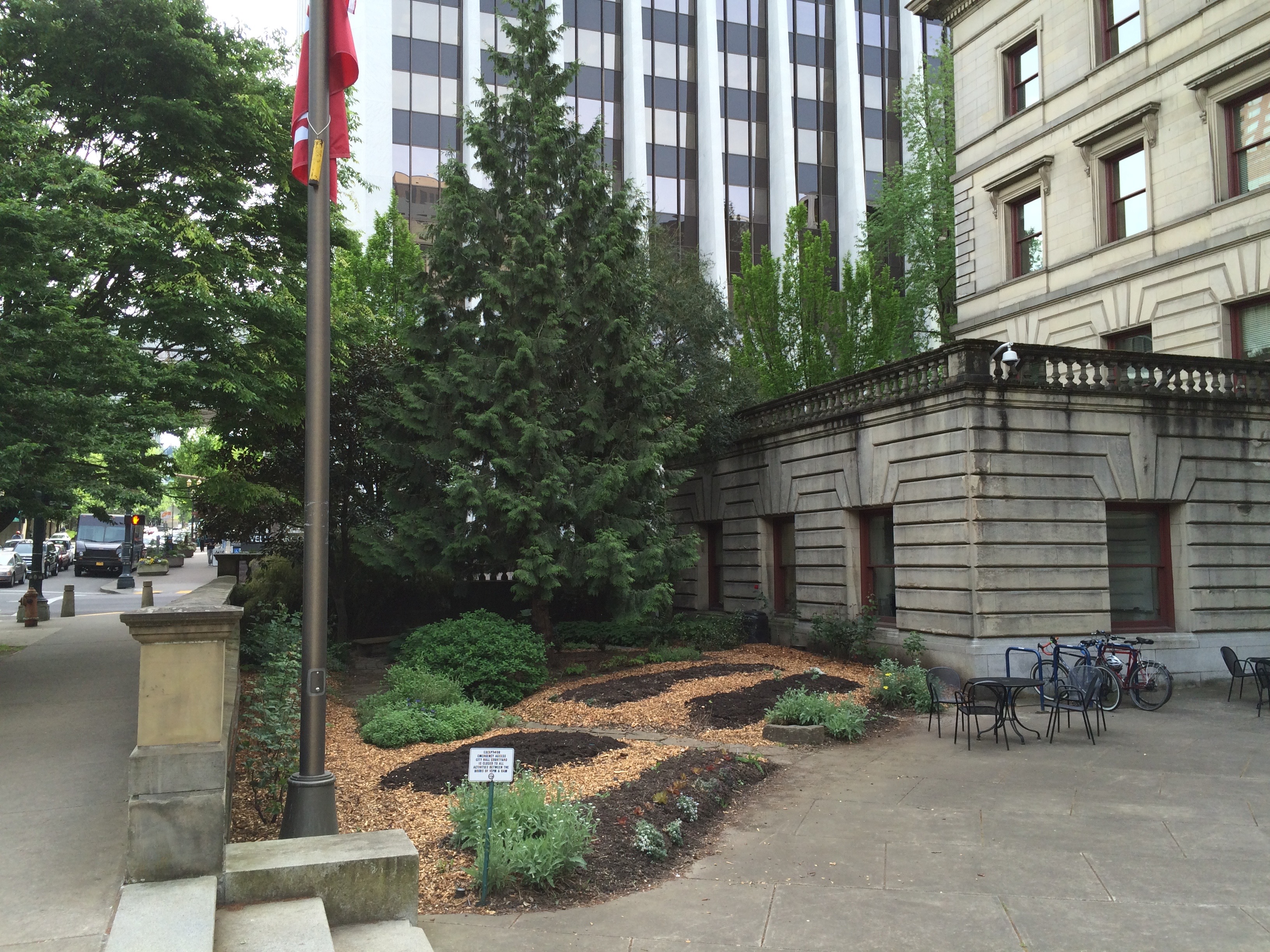 IMG_5183 ← Previous Next → This pic shows the situation shade potential with the Zelkoovas to the east the tower to the south, City Hall to the west and the growing Red Cedar, Magnolia and Azara in the garden. The roses to the left are weaker than ever.