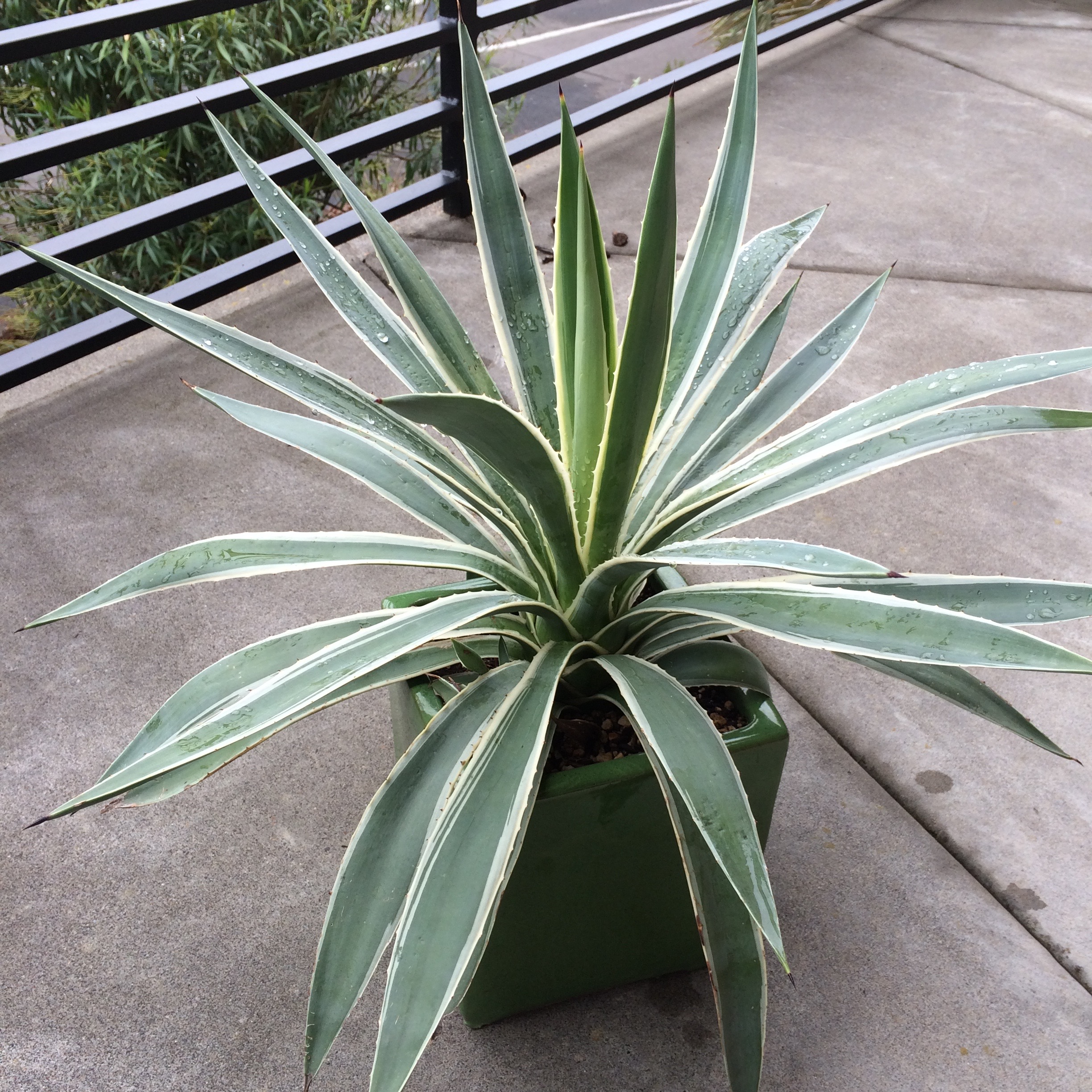 I’m leery of planting this one out with some sources claiming hardiness only to 25F while the Irish’s claim 16F, with heavy leaf damage, but overall is a tolerant plant as evidenced by it widespread use as a crop plant grown for its fiber, cordage, in more recent years replaced by A. sisaliana. This variegated form is a gift and will stay in the pot, at least until a pup, like the one popping up center left, can be potted and grown on for awhile. Not sure where I’ll put it.