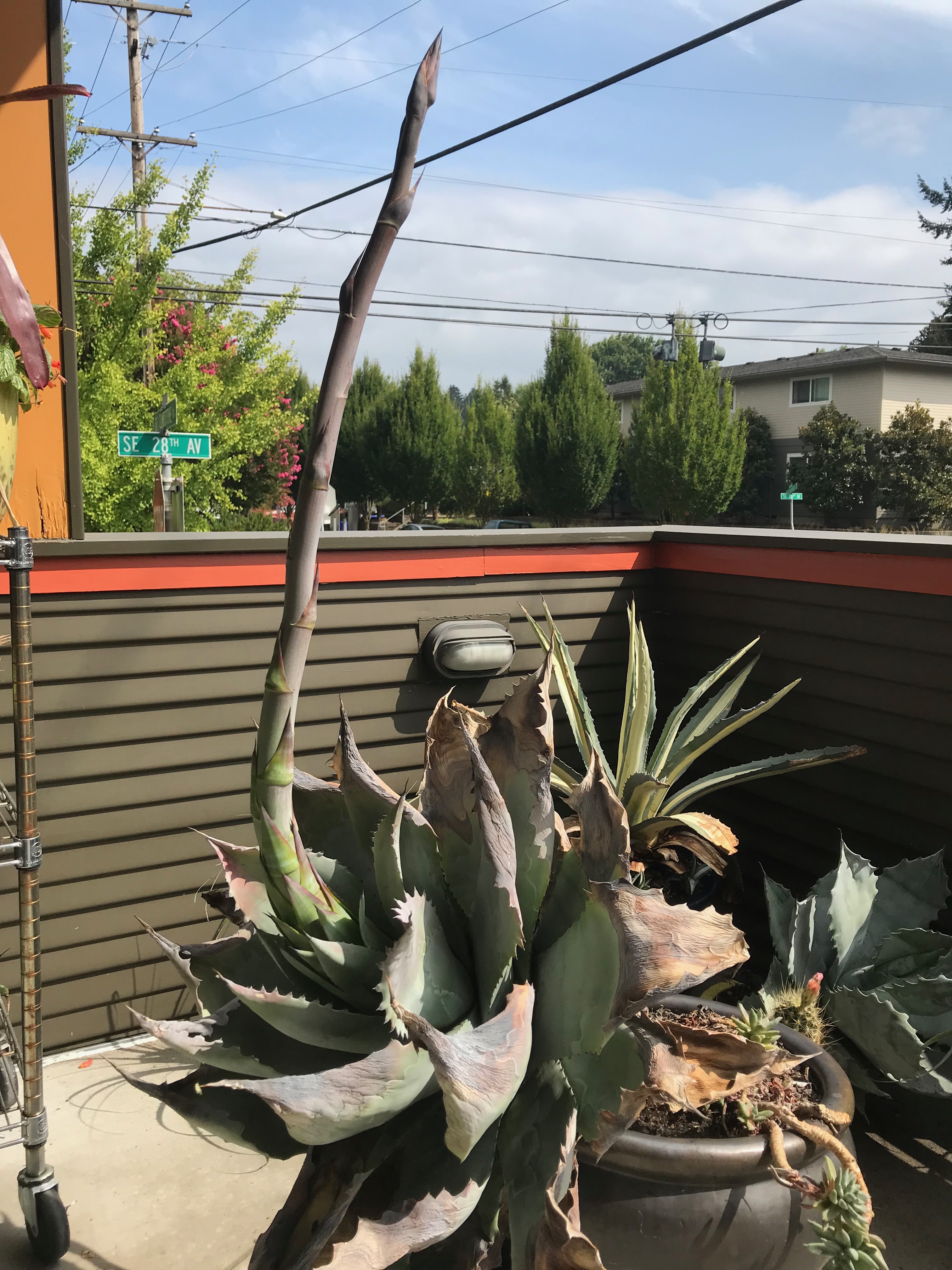 img_1893 ← Previous Agave colorata is one of the species that forms a short trunk so the plant tends to lay over, creating a bit of a balancing problem in a pot. I spun the pot around to encourage the quiote to grow back over the center of the pot.