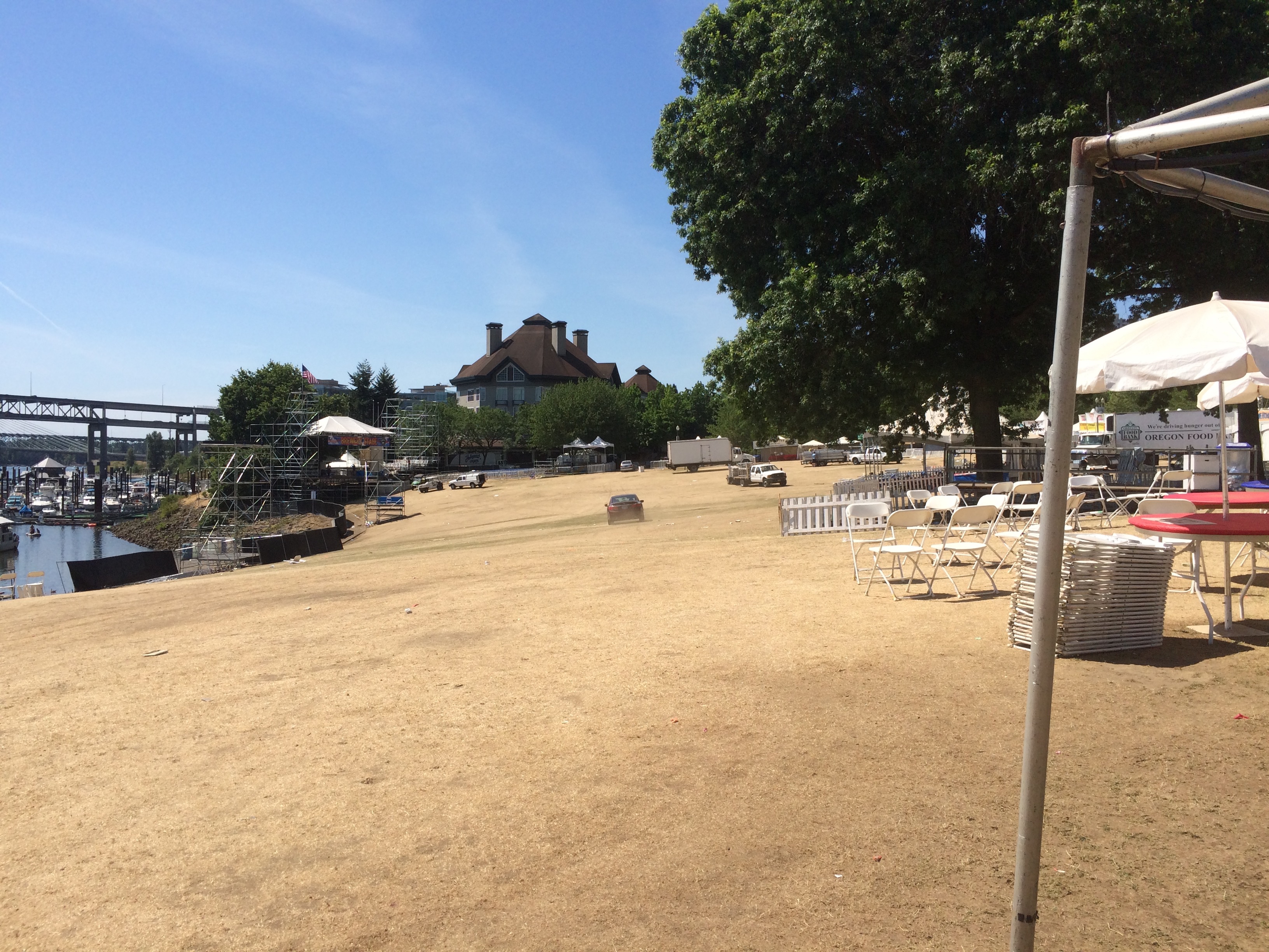 The ‘turf’ at the ‘bowl’ where the two main stages of the Blues Festival are positioned after the July show. The turf will take weeks to come back unable to withstand the many thousands of feet, summer’s heat and an irrigation system that is shut down for during much of set up, the event and cleanup. It is not a durable surface for this kind of use. Many sections of Waterfront Park, despite the efforts of staff, are severely compacted, leaving turf areas dominated by weedy Annual Blue Grass because of the political pressure to hold major events here with too little recovery time. If temperatures remain in the mid 80’s and higher after events recovery can take a month or more, frustrating staff, event organizers and the public.