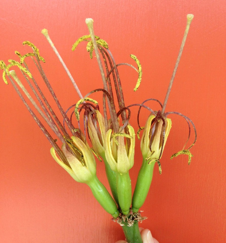 This is one of the lower umbels, the second peduncle from the bottom. The others contain more individual flowers. You can see my thumb tip at the bottom for some scale.This umbel was caught in the stage where the filaments are collapsing and the styles extending. Nectar has spilled to many surfaces. The tepals have begun to shrivel as well. Coarse pollen grains show on the anthers with some ‘spilled’ to other surfaces. Individual flowers aren’t particularly pretty.