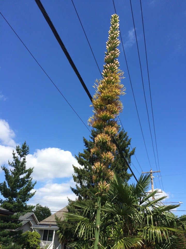 This shows several things: the intermediate structure of this hybrid cross of a Littaea parent with a Ditepalea Agave; how flowering progresses up the stem moving from the staminate/male period, with extended anthers to the pistilate/female period when the stamens have collapse and the styles are extended and erect and downward to the stage when the styles have collapsed and the flower begin to disintegrate. This picture was taken an even two weeks after the first flowers were opening (those first umbels were removed. One of which is pictured at the top of this posting.)