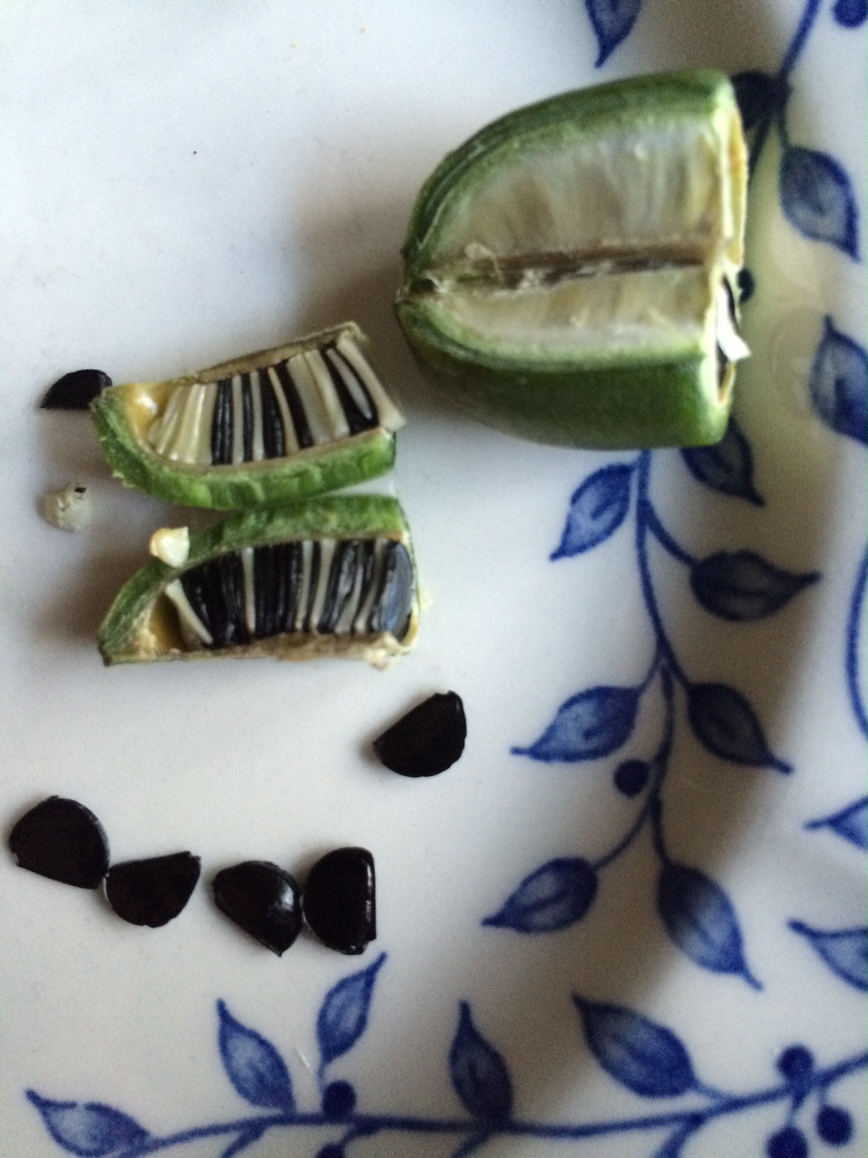 The black seeds here are about the size of watermelon seeds. The split chamber shows a lot of white ‘seeds’ stacked in the split chamber which are actually unfertilized ovules, forming ’empty’ skins. The larger piece of the ‘fruit’ shows the membrane between the chambers.